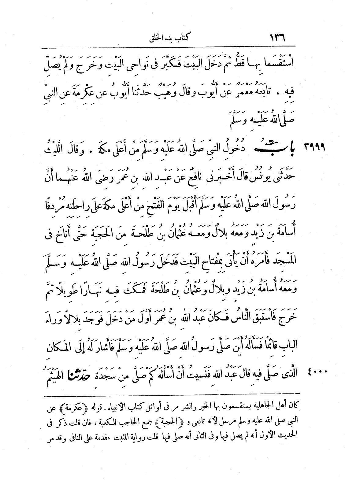 3999 - وَقَالَ اللَّيْثُ حَدَّثَنِى يُونُسُ قَالَ أَخْبَرَنِى نَافِعٌ عَنْ عَبْدِ اللَّهِ بْنِ عُمَرَ - رضى الله عنهما - أَنَّ رَسُولَ اللَّهِ صلى الله عليه وسلّم أَقْبَلَ يَوْمَ الْفَتْحِ مِنْ أَعْلَى مَكَّةَ عَلَى رَاحِلَتِهِ، مُرْدِفاً أُسَامَةَ بْنَ زَيْدٍ وَمَعَهُ بِلاَلٌ وَمَعَهُ عُثْمَانُ بْنُ طَلْحَةَ، مِنَ الْحَجَبَةِ حَتَّى أَنَاخَ فِى الْمَسْجِدِ، فَأَمَرَهُ أَنْ يَاتِىَ بِمِفْتَاحِ الْبَيْتِ، فَدَخَلَ رَسُولُ اللَّهِ صلى الله عليه وسلّم وَمَعَهُ أُسَامَةُ بْنُ زَيْدٍ وَبِلاَلٌ وَعُثْمَانُ بْنُ طَلْحَةَ، فَمَكَثَ فِيهِ نَهَاراً طَوِيلاً ثُمَّ خَرَجَ، فَاسْتَبَقَ النَّاسُ، فَكَانَ عَبْدُ اللَّهِ بْنُ عُمَرَ أَوَّلَ مَنْ دَخَلَ، فَوَجَدَ بِلاَلاً وَرَاءَ الْبَابِ قَائِماً، فَسَأَلَهُ أَيْنَ صَلَّى رَسُولُ اللَّهِ صلى الله عليه وسلّم فَأَشَارَ لَهُ إِلَى الْمَكَانِ الَّذِى صَلَّى فِيهِ. قَالَ عَبْدُ اللَّهِ فَنَسِيتُ أَنْ أَسْأَلَهُ كَمْ صَلَّى مِنْ سَجْدَةٍ.