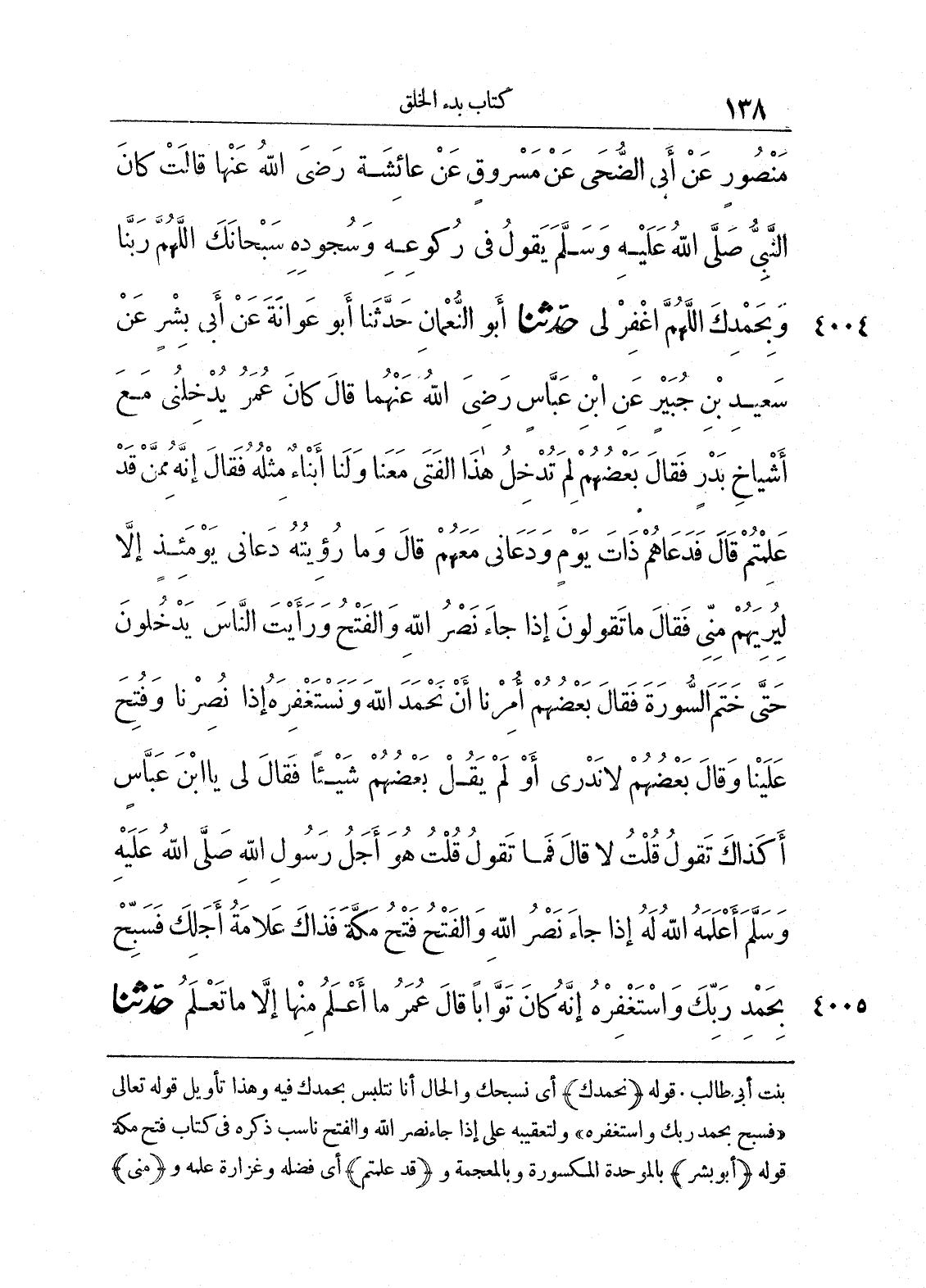 4004 - حَدَّثَنَا أَبُو النُّعْمَانِ حَدَّثَنَا أَبُو عَوَانَةَ عَنْ أَبِى بِشْرٍ عَنْ سَعِيدِ بْنِ جُبَيْرٍ عَنِ ابْنِ عَبَّاسٍ - رضى الله عنهما - قَالَ كَانَ عُمَرُ يُدْخِلُنِى مَعَ أَشْيَاخِ بَدْرٍ، فَقَالَ بَعْضُهُمْ لِمَ تُدْخِلُ هَذَا الْفَتَى مَعَنَا، وَلَنَا أَبْنَاءٌ مِثْلُهُ فَقَالَ إِنَّهُ مِمَّنْ قَدْ عَلِمْتُمْ. قَالَ فَدَعَاهُمْ ذَاتَ يَوْمٍ، وَدَعَانِى مَعَهُمْ قَالَ وَمَا رُئِيتُهُ دَعَانِى يَوْمَئِذٍ إِلاَّ لِيُرِيَهُمْ مِنِّى فَقَالَ مَا تَقُولُونَ (إِذَا جَاءَ نَصْرُ اللَّهِ وَالْفَتْحُ * وَرَأَيْتَ النَّاسَ يَدْخُلُونَ) حَتَّى خَتَمَ السُّورَةَ، فَقَالَ بَعْضُهُمْ أُمِرْنَا أَنْ نَحْمَدَ اللَّهَ وَنَسْتَغْفِرَهُ، إِذَا نُصِرْنَا وَفُتِحَ عَلَيْنَا. وَقَالَ بَعْضُهُمْ لاَ نَدْرِى. أَوْ لَمْ يَقُلْ بَعْضُهُمْ شَيْئاً. فَقَالَ لِى يَا ابْنَ عَبَّاسٍ أَكَذَاكَ تَقُولُ قُلْتُ لاَ. قَالَ فَمَا تَقُولُ قُلْتُ هُوَ أَجَلُ رَسُولِ اللَّهِ صلى الله عليه وسلّم أَعْلَمَهُ اللَّهُ لَهُ (إِذَا جَاءَ نَصْرُ اللَّهِ وَالْفَتْحُ) فَتْحُ مَكَّةَ، فَذَاكَ عَلاَمَةُ أَجَلِكَ (فَسَبِّحْ بِحَمْدِ رَبِّكَ وَاسْتَغْفِرْهُ إِنَّهُ كَانَ تَوَّاباً) قَال عُمَرُ مَا أَعْلَمُ مِنْهَا إِلاَّ مَا تَعْلَمُ.