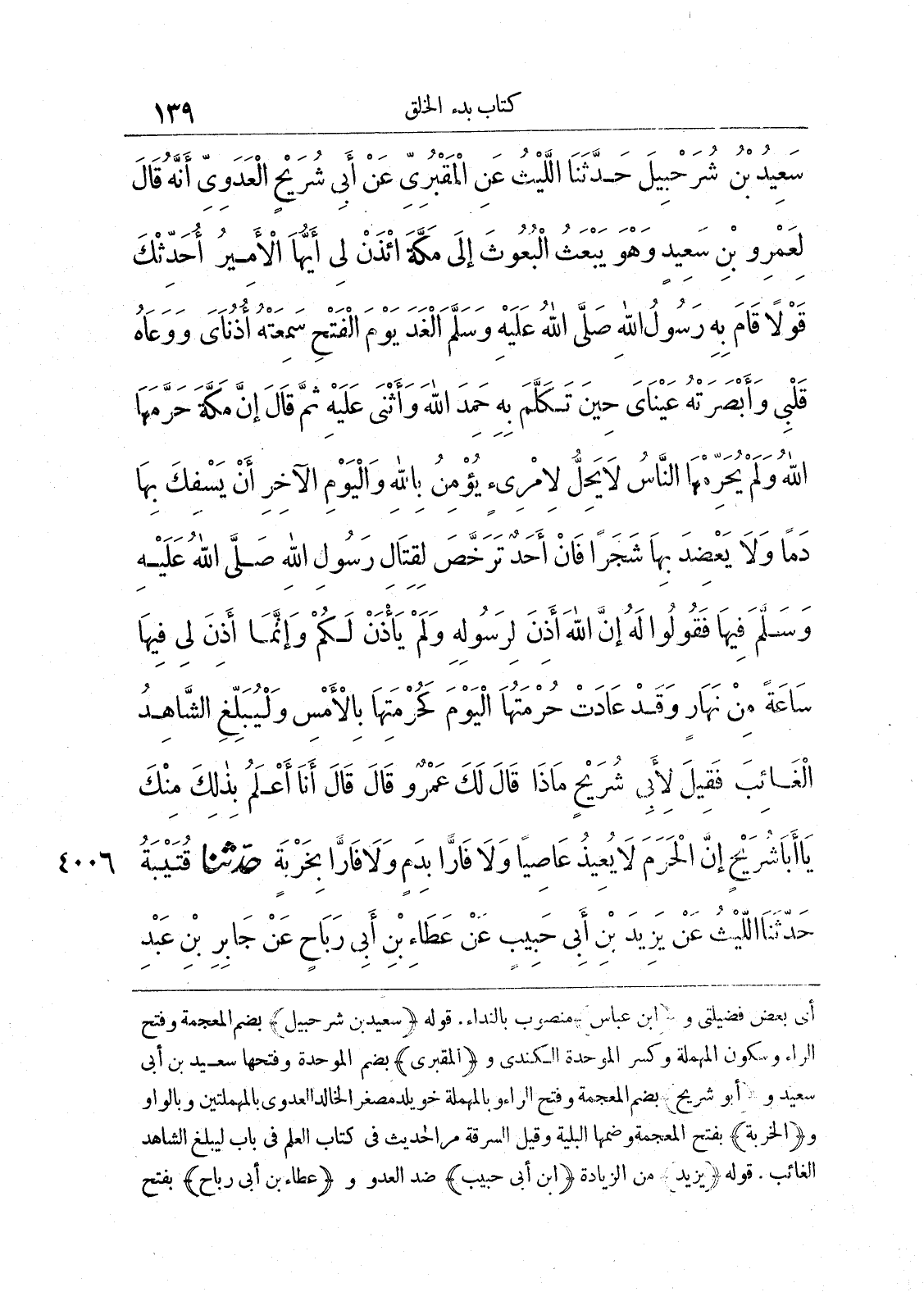 سَعِيدُ بْنُ شُرَحْبِيلَ حَدَّثَنَا اللَّيْثُ عَنِ الْمَقْبُرِىِّ عَنْ أَبِى شُرَيْحٍ الْعَدَوِىِّ أَنَّهُ قَالَ لِعَمْرِو بْنِ سَعِيدٍ وَهْوَ يَبْعَثُ الْبُعُوثَ إِلَى مَكَّةَ ائْذَنْ لِى أَيُّهَا الأَمِيرُ أُحَدِّثْكَ قَوْلاً قَامَ بِهِ رَسُولُ اللَّهِ صلى الله عليه وسلّم الْغَدَ يَوْمَ الْفَتْحِ، سَمِعَتْهُ أُذَنَاىَ وَوَعَاهُ قَلْبِى، وَأَبْصَرَتْهُ عَيْنَاىَ، حِينَ تَكَلَّمَ بِهِ حَمِدَ اللَّهَ وَأَثْنَى عَلَيْهِ ثُمَّ قَالَ «إِنَّ مَكَّةَ حَرَّمَهَا اللَّهُ وَلَمْ يُحَرِّمْهَا النَّاسُ، لاَ يَحِلُّ لاِمْرِئٍ يُؤْمِنُ بِاللَّهِ وَالْيَوْمِ الآخِرِ أَنْ يَسْفِكَ بِهَا دَماً، وَلاَ يَعْضِدَ بِهَا شَجَراً، فَإِنْ أَحَدٌ تَرَخَّصَ لِقِتَالِ رَسُولِ اللَّهِ صلى الله عليه وسلّم فِيهَا فَقُولُوا لَهُ إِنَّ اللَّهَ أَذِنَ لِرَسُولِهِ، وَلَمْ يَاذَنْ لَكُمْ. وَإِنَّمَا أَذِنَ لِى فِيهَا سَاعَةً مِنْ نَهَارٍ، وَقَدْ عَادَتْ حُرْمَتُهَا الْيَوْمَ كَحُرْمَتِهَا بِالأَمْسِ، وَلْيُبَلِّغِ الشَّاهِدُ الْغَائِبَ». فَقِيلَ لأَبِى شُرَيْحٍ مَاذَا قَال لَكَ عَمْرٌو قَالَ قَالَ أَنَا أَعْلَمُ بِذَلِكَ مِنْكَ يَا أَبَا شُرَيْحٍ، إِنَّ الْحَرَمَ لاَ يُعِيذُ عَاصِياً، وَلاَ فَارًّا بِدَمٍ، وَلاَ فَارًّا بِخَرْبَةٍ.