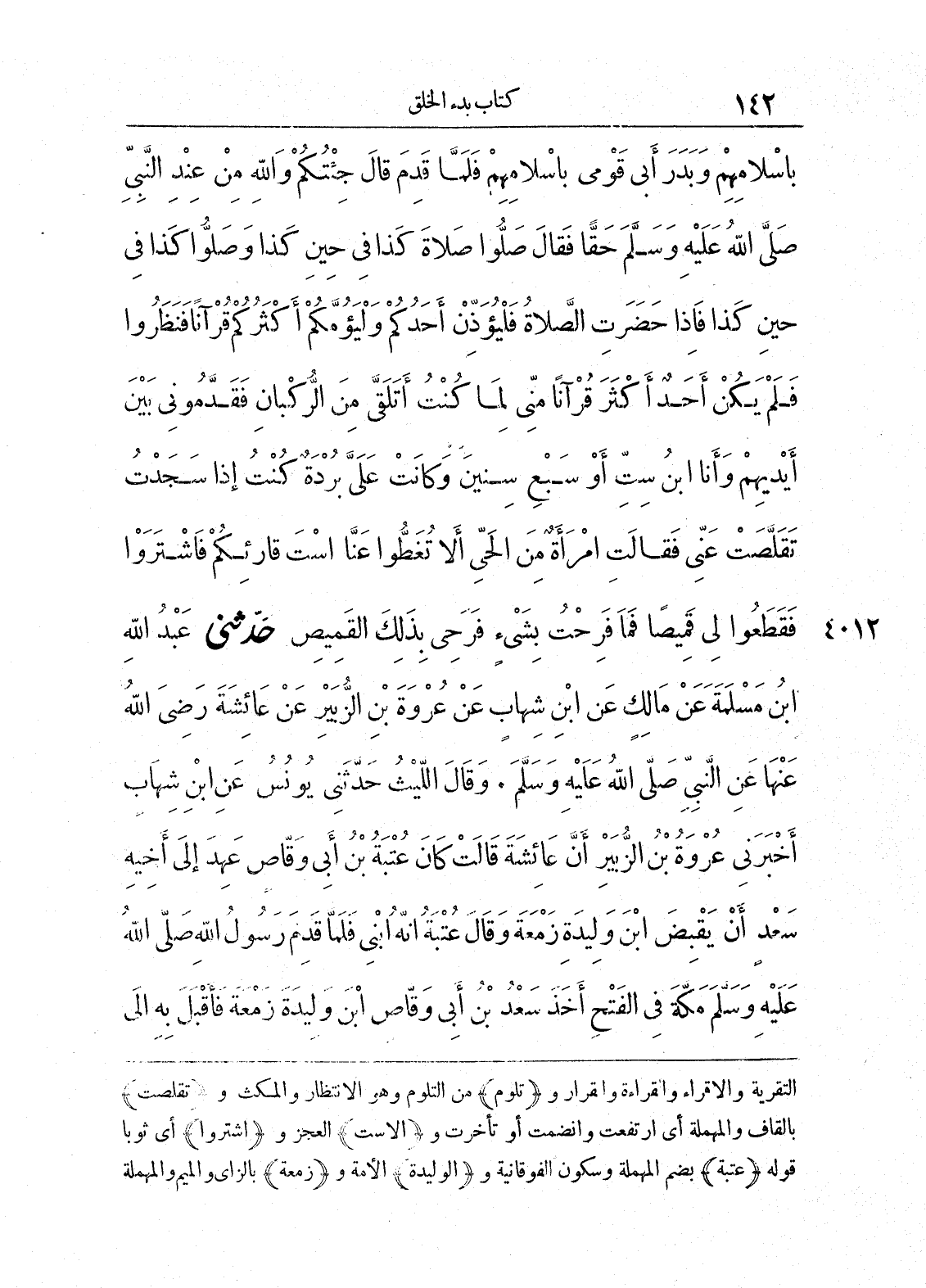 بِإِسْلاَمِهِمْ، وَبَدَرَ أَبِى قَوْمِى بِإِسْلاَمِهِمْ، فَلَمَّا قَدِمَ قَالَ جِئْتُكُمْ وَاللَّهِ مِنْ عِنْدِ النَّبِىِّ صلى الله عليه وسلّم حَقًّا فَقَالَ «صَلُّوا صَلاَةَ كَذَا فِى حِينِ كَذَا، وَصَلُّوا كَذَا فِى حِينِ كَذَا، فَإِذَا حَضَرَتِ الصَّلاَةُ، فَلْيُؤَذِّنْ أَحَدُكُمْ، وَلْيَؤُمَّكُمْ أَكْثَرُكُمْ قُرْآناً». فَنَظَرُوا فَلَمْ يَكُنْ أَحَدٌ أَكْثَرَ قُرْآناً مِنِّى، لِمَا كُنْتُ أَتَلَقَّى مِنَ الرُّكْبَانِ، فَقَدَّمُونِى بَيْنَ أَيْدِيهِمْ، وَأَنَا ابْنُ سِتٍّ أَوْ سَبْعِ، سِنِينَ وَكَانَتْ عَلَىَّ بُرْدَةٌ، كُنْتُ إِذَا سَجَدْتُ تَقَلَّصَتْ عَنِّى، فَقَالَتِ امْرَأَةٌ مِنَ الْحَىِّ أَلاَ تُغَطُّوا عَنَّا اسْتَ قَارِئِكُمْ. فَاشْتَرَوْا فَقَطَعُوا لِى قَمِيصاً، فَمَا فَرِحْتُ بِشَىْءٍ فَرَحِى بِذَلِكَ الْقَمِيصِ.