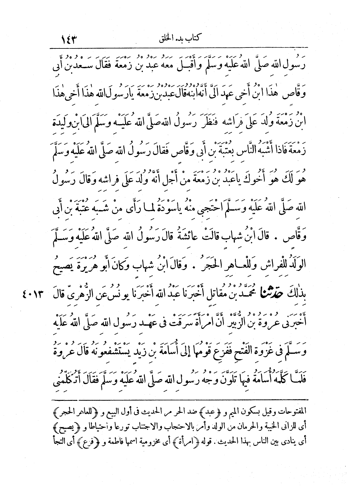 رَسُولِ اللَّهِ صلى الله عليه وسلّم، وَأَقْبَلَ مَعَهُ عَبْدُ بْنُ زَمْعَةَ، فَقَالَ سَعْدُ بْنُ أَبِى وَقَّاصٍ هَذَا ابْنُ أَخِى، عَهِدَ إِلَىَّ أَنَّهُ ابْنُهُ. قَالَ عَبْدُ بْنُ زَمْعَةَ يَا رَسُولَ اللَّهِ، هَذَا أَخِى، هَذَا ابْنُ زَمْعَةَ، وُلِدَ عَلَى فِرَاشِهِ. فَنَظَرَ رَسُولُ اللَّهِ صلى الله عليه وسلّم إِلَى ابْنِ وَلِيدَةِ زَمْعَةَ، فَإِذَا أَشْبَهُ النَّاسِ بِعُتْبَةَ بْنِ أَبِى وَقَّاصٍ، فَقَالَ رَسُولُ اللَّه صلى الله عليه وسلّم «هُوَ لَكَ، هُوَ أَخُوكَ يَا عَبْدُ بْنَ زَمْعَةَ». مِنْ أَجْلِ أَنَّهُ وُلِدَ عَلَى فِرَاشِهِ، وَقَالَ رَسُولُ اللَّهِ صلى الله عليه وسلّم «احْتَجِبِى مِنْهُ يَا سَوْدَةُ». لِمَا رَأَى مِنْ شَبَهِ عُتْبَةَ بْنِ أَبِى وَقَّاصٍ. قَالَ ابْنُ شِهَابٍ قَالَتْ عَائِشَةُ قَالَ رَسُولُ اللَّهِ صلى الله عليه وسلّم «الْوَلَدُ لِلْفِرَاشِ وَلِلْعَاهِرِ الْحَجَرُ». وَقَالَ ابْنُ شِهَابٍ وَكَانَ أَبُو هُرَيْرَةَ يَصِيحُ بِذَلِكَ.