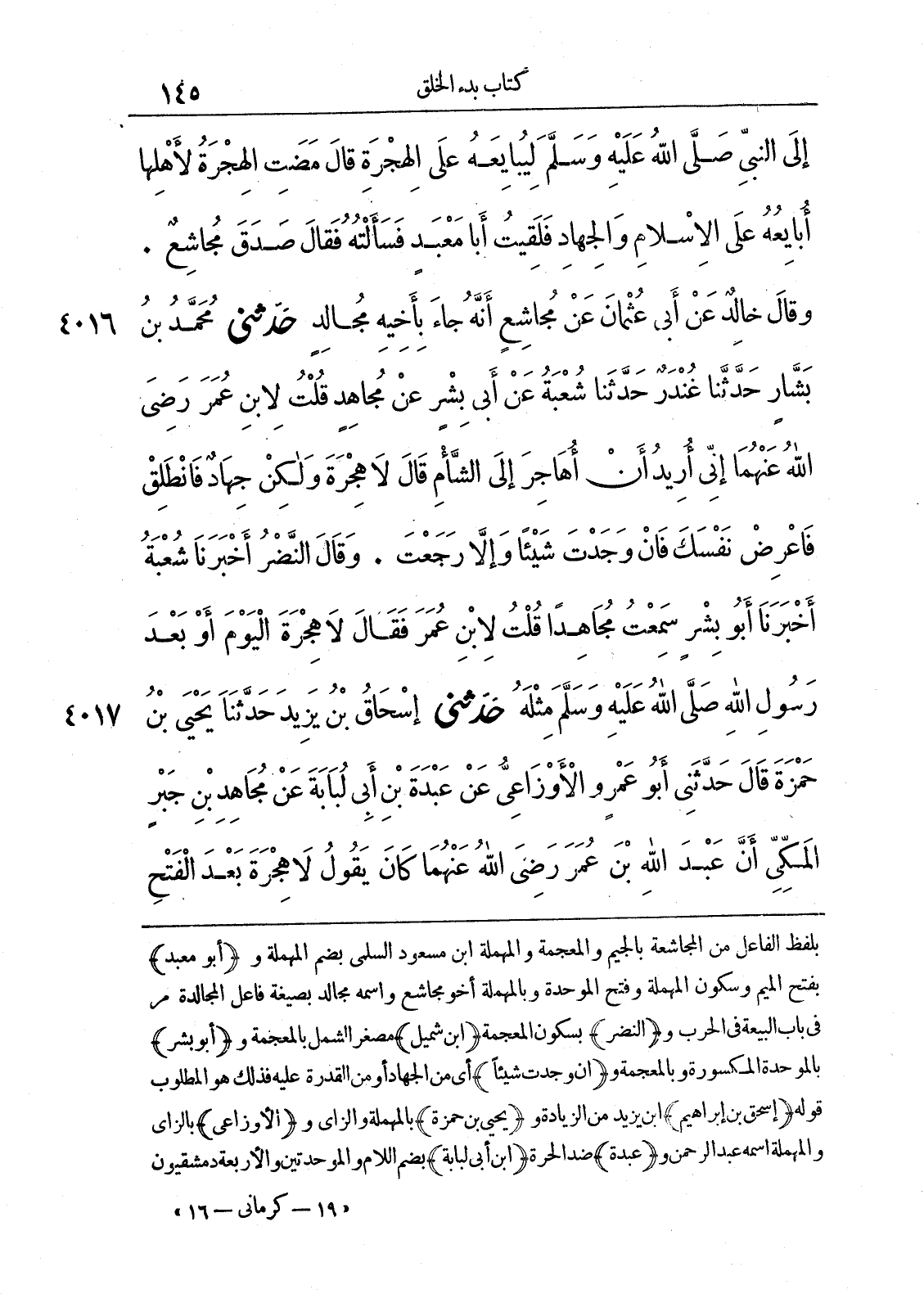 4016 - حَدَّثَنِى مُحَمَّدُ بْنُ بَشَّارٍ حَدَّثَنَا غُنْدَرٌ حَدَّثَنَا شُعْبَةُ عَنْ أَبِى بِشْرٍ عَنْ مُجَاهِدٍ قُلْتُ لاِبْنِ عُمَرَ - رضى الله عنهما - إِنِّى أُرِيدُ أَنْ أُهَاجِرَ إِلَى الشَّامِ. قَالَ لاَ هِجْرَةَ وَلَكِنْ جِهَادٌ، فَانْطَلِقْ فَاعْرِضْ نَفْسَكَ، فَإِنْ وَجَدْتَ شَيْئاً وَإِلاَّ رَجَعْتَ. وَقَالَ النَّضْرُ أَخْبَرَنَا شُعْبَةُ أَخْبَرَنَا أَبُو بِشْرٍ سَمِعْتُ مُجَاهِداً قُلْتُ لاِبْنِ عُمَرَ فَقَالَ لاَ هِجْرَةَ الْيَوْمَ، أَوْ بَعْدَ رَسُولِ اللَّهِ صلى الله عليه وسلّم مِثْلَهُ.