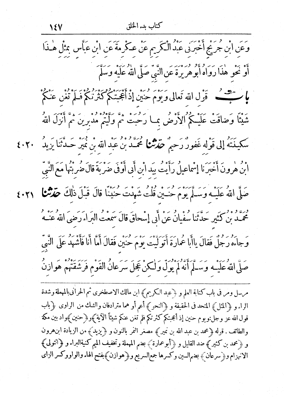 مرسل ومر في باب كتابة العلم و) عبد الكريم (ابن مالك الاصطخري ثم الحراني بالمهملة وشدة الراء والمثل المتحد في الحقيقة و) النحو (اعم أو هما مترادفان والشك من الراوي باب قول الله عز وجل:)) ويوم حنين إذ أعجبتكم كثرتكم فلم تغن عنكم شيئا ((الآية وحنين واد بين مكة والطائف. قوله محمد بن عبد الله بن نمير (مصغر النمر بالنون ويزيد من الزيادة ان هارون و) محمد بن كثير (ضد القليل و) أبو عمارة (بضم المهملة وتخفيف الميم كنية البراء و) التولي (الانهزام و) سرعان (بضم السين وكسرها جمع السريع و) هوزان (بفتح الهاء والواو وكسر الزاي