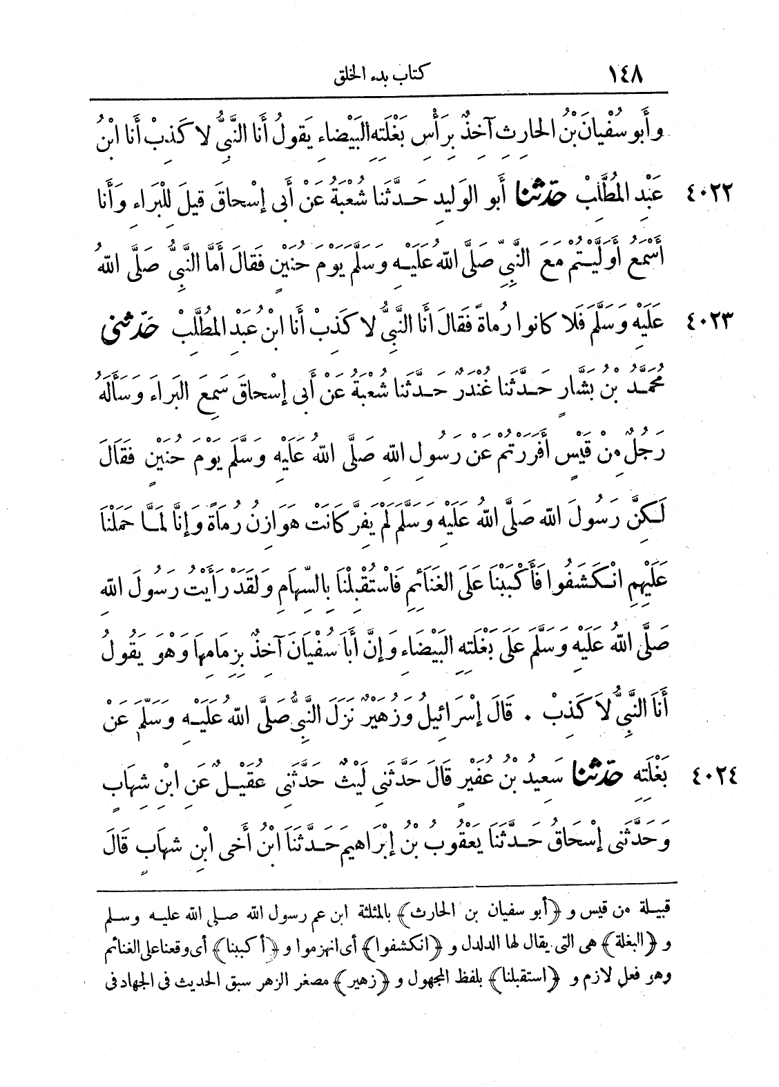 4022 - حَدَّثَنَا أَبُو الْوَلِيدِ حَدَّثَنَا شُعْبَةُ عَنْ أَبِى إِسْحَاقَ قِيلَ لِلْبَرَاءِ وَأَنَا أَسْمَعُ أَوَلَّيْتُمْ مَعَ النَّبِىِّ صلى الله عليه وسلّم يَوْمَ حُنَيْنٍ فَقَالَ أَمَّا النَّبِىُّ صلى الله عليه وسلّم فَلاَ، كَانُوا رُمَاةً فَقَالَ «أَنَا النَّبِىُّ لاَ كَذِبْ أَنَا ابْنُ عَبْدِ الْمُطَّلِبْ».