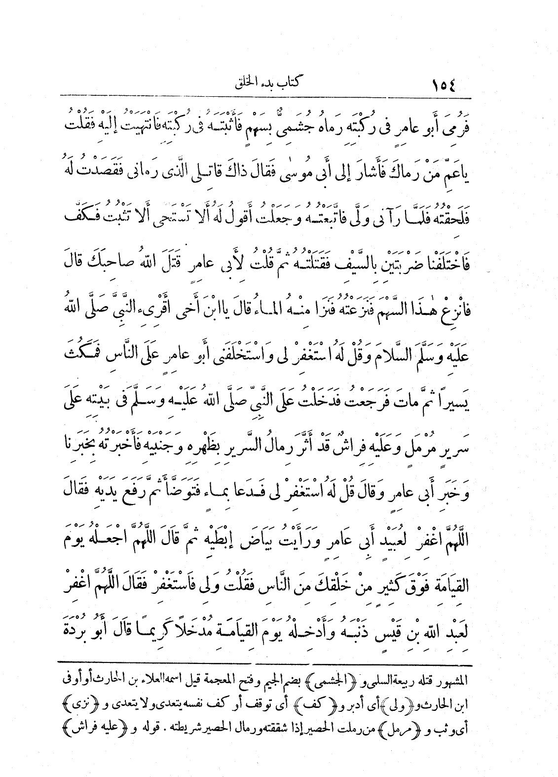فَرُمِىَ أَبُو عَامِرٍ فِى رُكْبَتِهِ، رَمَاهُ جُشَمِىٌّ بِسَهْمٍ فَأَثْبَتَهُ فِى رُكْبَتِهِ، فَانْتَهَيْتُ إِلَيْهِ فَقُلْتُ يَا عَمِّ مَنْ رَمَاكَ فَأَشَارَ إِلَى أَبِى مُوسَى فَقَالَ ذَاكَ قَاتِلِى الَّذِى رَمَانِى. فَقَصَدْتُ لَهُ فَلَحِقْتُهُ فَلَمَّا رَآنِى وَلَّى فَاتَّبَعْتُهُ وَجَعَلْتُ أَقُولُ لَهُ أَلاَ تَسْتَحِى، أَلاَ تَثْبُتُ. فَكَفَّ فَاخْتَلَفْنَا ضَرْبَتَيْنِ بِالسَّيْفِ فَقَتَلْتُهُ ثُمَّ قُلْتُ لأَبِى عَامِرٍ قَتَلَ اللَّهُ صَاحِبَكَ. قَالَ فَانْزِعْ هَذَا السَّهْمَ فَنَزَعْتُهُ فَنَزَا مِنْهُ الْمَاءُ. قَالَ يَا ابْنَ أَخِى أَقْرِئِ النَّبِىَّ صلى الله عليه وسلّم السَّلاَمَ، وَقُلْ لَهُ اسْتَغْفِرْ لِى. وَاسْتَخْلَفَنِى أَبُو عَامِرٍ عَلَى النَّاسِ، فَمَكَثَ يَسِيراً ثُمَّ مَاتَ، فَرَجَعْتُ فَدَخَلْتُ عَلَى النَّبِىِّ صلى الله عليه وسلّم فِى بَيْتِهِ عَلَى سَرِيرٍ مُرْمَلٍ وَعَلَيْهِ فِرَاشٌ قَدْ أَثَّرَ رِمَالُ السَّرِيرِ بِظَهْرِهِ وَجَنْبَيْهِ، فَأَخْبَرْتُهُ بِخَبَرِنَا وَخَبَرِ أَبِى عَامِرٍ، وَقَالَ قُلْ لَهُ اسْتَغْفِرْ لِى، فَدَعَا بِمَاءٍ فَتَوَضَّأَ ثُمَّ رَفَعَ يَدَيْهِ فَقَالَ «اللَّهُمَّ اغْفِرْ لِعُبَيْدٍ أَبِى عَامِرٍ». وَرَأَيْتُ بَيَاضَ إِبْطَيْهِ ثُمَّ قَالَ «اللَّهُمَّ اجْعَلْهُ يَوْمَ الْقِيَامَةِ فَوْقَ كَثِيرٍ مِنْ خَلْقِكَ مِنَ النَّاسِ». فَقُلْتُ وَلِى فَاسْتَغْفِرْ. فَقَالَ «اللَّهُمَّ اغْفِرْ لِعَبْدِ اللَّهِ بْنِ قَيْسٍ ذَنْبَهُ وَأَدْخِلْهُ يَوْمَ الْقِيَامَةِ مُدْخَلاً كَرِيماً». قَالَ أَبُو بُرْدَةَ