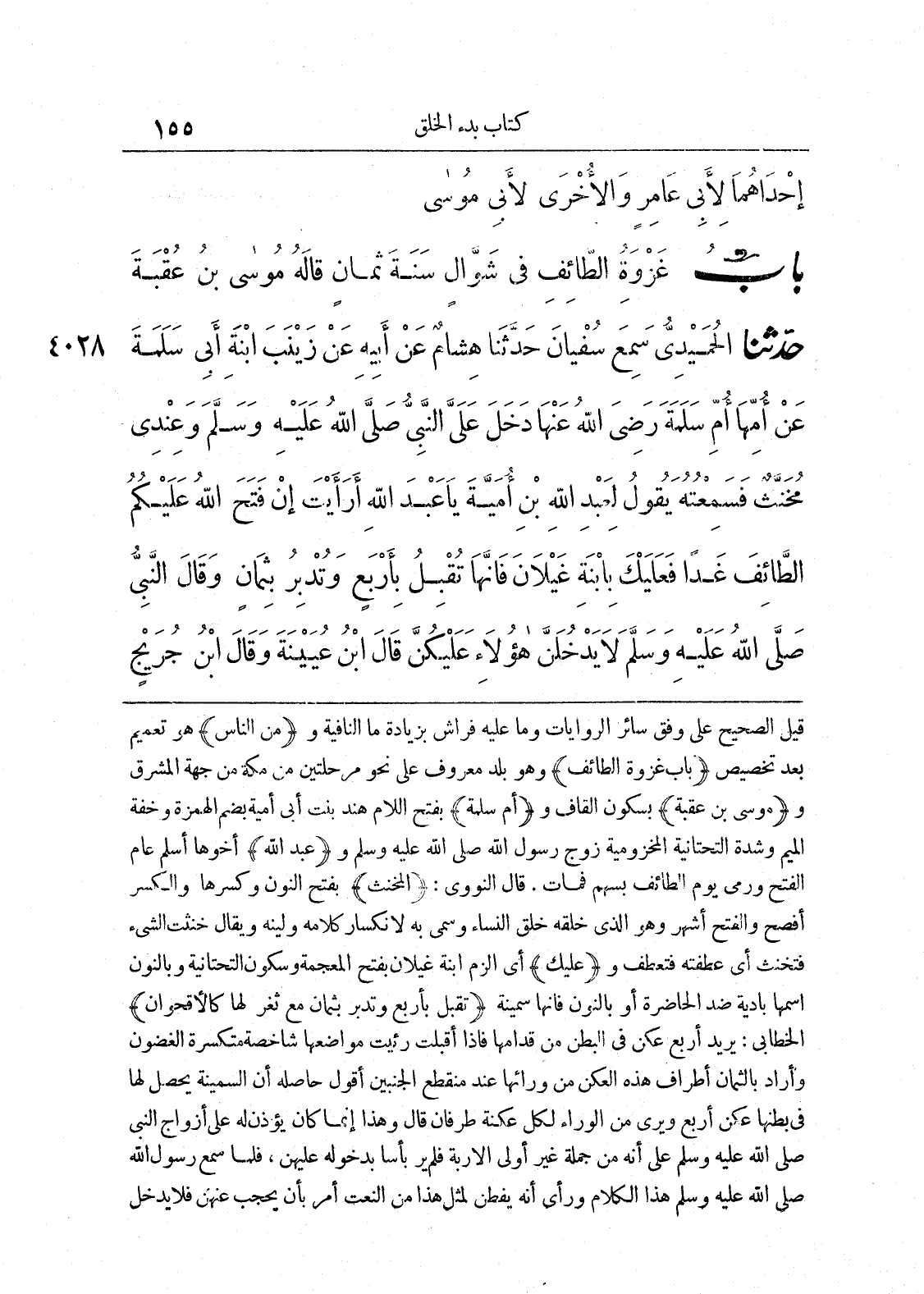 4028 - حَدَّثَنَا الْحُمَيْدِىُّ سَمِعَ سُفْيَانَ حَدَّثَنَا هِشَامٌ عَنْ أَبِيهِ عَنْ زَيْنَبَ ابْنَةِ أَبِى سَلَمَةَ عَنْ أُمِّهَا أُمِّ سَلَمَةَ - رضى الله عنها - دَخَلَ عَلَىَّ النَّبِىُّ صلى الله عليه وسلّم وَعِنْدِى مُخَنَّثٌ فَسَمِعْتُهُ يَقُولُ لِعَبْدِ اللَّهِ بْنِ أَبِى أُمَيَّةَ يَا عَبْدَ اللَّهِ أَرَأَيْتَ إِنْ فَتَحَ اللَّهُ عَلَيْكُمُ الطَّائِفَ غَداً فَعَلَيْكَ بِابْنَةِ غَيْلاَنَ، فَإِنَّهَا تُقْبِلُ بِأَرْبَعٍ وَتُدْبِرُ بِثَمَانٍ. وَقَالَ النَّبِىُّ صلى الله عليه وسلّم «لاَ يَدْخُلَنَّ هَؤُلاَءِ عَلَيْكُنَّ». قَالَ ابْنُ عُيَيْنَةَ وَقَالَ ابْنُ جُرَيْجٍ