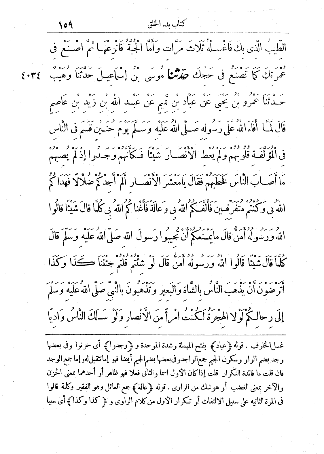 4034 - حَدَّثَنَا مُوسَى بْنُ إِسْمَاعِيلَ حَدَّثَنَا وُهَيْبٌ حَدَّثَنَا عَمْرُو بْنُ يَحْيَى عَنْ عَبَّادِ بْنِ تَمِيمٍ عَنْ عَبْدِ اللَّهِ بْنِ زَيْدِ بْنِ عَاصِمٍ قَالَ لَمَّا أَفَاءَ اللَّهُ عَلَى رَسُولِهِ صلى الله عليه وسلّم يَوْمَ حُنَيْنٍ قَسَمَ فِى النَّاسِ فِى الْمُؤَلَّفَةِ قُلُوبُهُمْ، وَلَمْ يُعْطِ الأَنْصَارَ شَيْئاً، فَكَأَنَّهُمْ وَجَدُوا إِذْ لَمْ يُصِبْهُمْ مَا أَصَابَ النَّاسَ فَخَطَبَهُمْ فَقَالَ «يَا مَعْشَرَ الأَنْصَارِ أَلَمْ أَجِدْكُمْ ضُلاَّلاً فَهَدَاكُمُ اللَّهُ بِى، وَكُنْتُمْ مُتَفَرِّقِينَ فَأَلَّفَكُمُ اللَّهُ بِى وَعَالَةً، فَأَغْنَاكُمُ اللَّهُ بِى». كُلَّمَا قَالَ شَيْئاً قَالُوا اللَّهُ وَرَسُولُهُ أَمَنُّ. قَالَ «مَا يَمْنَعُكُمْ أَنْ تُجِيبُوا رَسُولَ اللَّهِ صلى الله عليه وسلّم». قَالَ كُلَّمَا قَالَ شَيْئاً قَالُوا اللَّهُ وَرَسُولُهُ أَمَنُّ. قَالَ «لَوْ شِئْتُمْ قُلْتُمْ جِئْتَنَا كَذَا وَكَذَا. أَتَرْضَوْنَ أَنْ يَذْهَبَ النَّاسُ بِالشَّاةِ وَالْبَعِيرِ، وَتَذْهَبُونَ بِالنَّبِىِّ صلى الله عليه وسلّم إِلَى رِحَالِكُمْ، لَوْلاَ الْهِجْرَةُ لَكُنْتُ امْرَأً مِنَ الأَنْصَارِ، وَلَوْ سَلَكَ النَّاسُ وَادِياً