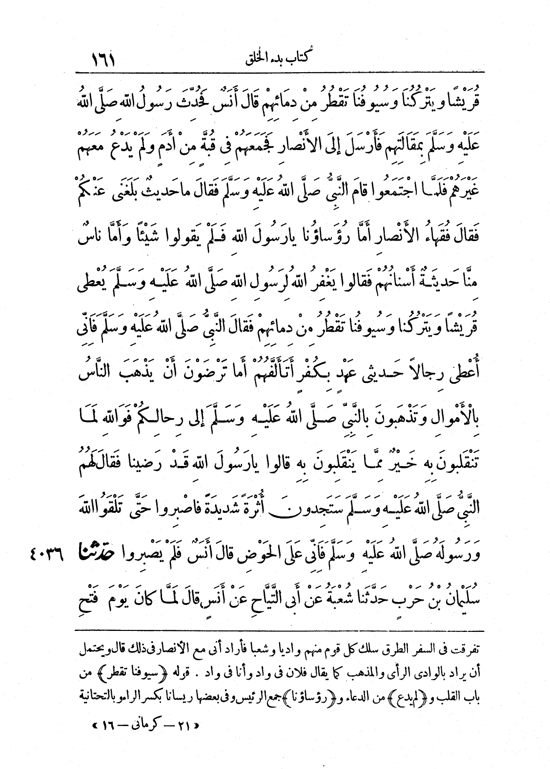 قُرَيْشاً وَيَتْرُكُنَا، وَسُيُوفُنَا تَقْطُرُ مِنْ دِمَائِهِمْ. قَالَ أَنَسٌ فَحُدِّثَ رَسُولُ اللَّهِ صلى الله عليه وسلّم بِمَقَالَتِهِمْ، فَأَرْسَلَ إِلَى الأَنْصَارِ فَجَمَعَهُمْ فِى قُبَّةٍ مِنْ أَدَمٍ وَلَمْ يَدْعُ مَعَهُمْ غَيْرَهُمْ، فَلَمَّا اجْتَمَعُوا قَامَ النَّبِىُّ صلى الله عليه وسلّم فَقَالَ «مَا حَدِيثٌ بَلَغَنِى عَنْكُمْ». فَقَالَ فُقَهَاءُ الأَنْصَارِ أَمَّا رُؤَسَاؤُنَا يَا رَسُولَ اللَّهِ فَلَمْ يَقُولُوا شَيْئاً، وَأَمَّا نَاسٌ مِنَّا حَدِيثَةٌ أَسْنَانُهُمْ فَقَالُوا يَغْفِرُ اللَّهُ لِرَسُولِ اللَّهِ صلى الله عليه وسلّم يُعْطِى قُرَيْشاً وَيَتْرُكُنَا، وَسُيُوفُنَا تَقْطُرُ مِنْ دِمَائِهِمْ. فَقَالَ النَّبِىُّ صلى الله عليه وسلّم «فَإِنِّى أُعْطِى رِجَالاً حَدِيثِى عَهْدٍ بِكُفْرٍ، أَتَأَلَّفُهُمْ، أَمَا تَرْضَوْنَ أَنْ يَذْهَبَ النَّاسُ بِالأَمْوَالِ وَتَذْهَبُونَ بِالنَّبِىِّ صلى الله عليه وسلّم إِلَى رِحَالِكُمْ، فَوَاللَّهِ لَمَا تَنْقَلِبُونَ بِهِ خَيْرٌ مِمَّا يَنْقَلِبُونَ بِهِ». قَالُوا يَا رَسُولَ اللَّهِ قَدْ رَضِينَا. فَقَالَ لَهُمُ النَّبِىُّ صلى الله عليه وسلّم «سَتَجِدُونَ أُثْرَةً شَدِيدَةً، فَاصْبِرُوا حَتَّى تَلْقَوُا اللَّهَ وَرَسُولَهُ صلى الله عليه وسلّم فَإِنِّى عَلَى الْحَوْضِ». قَالَ أَنَسٌ فَلَمْ يَصْبِرُوا.