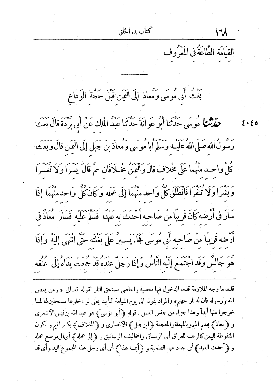 4045 - حَدَّثَنَا مُوسَى حَدَّثَنَا أَبُو عَوَانَةَ حَدَّثَنَا عَبْدُ الْمَلِكِ عَنْ أَبِى بُرْدَةَ قَالَ بَعَثَ رَسُولُ اللَّهِ صلى الله عليه وسلّم أَبَا مُوسَى وَمُعَاذَ بْنَ جَبَلٍ إِلَى الْيَمَنِ، قَالَ وَبَعَثَ كُلَّ وَاحِدٍ مِنْهُمَا عَلَى مِخْلاَفٍ قَالَ وَالْيَمَنُ مِخْلاَفَانِ ثُمَّ قَالَ «يَسِّرَا وَلاَ تُعَسِّرَا، وَبَشِّرَا وَلاَ تُنَفِّرَا». فَانْطَلَقَ كُلُّ وَاحِدٍ مِنْهُمَا إِلَى عَمَلِهِ، وَكَانَ كُلُّ وَاحِدٍ مِنْهُمَا إِذَا سَارَ فِى أَرْضِهِ كَانَ قَرِيباً مِنْ صَاحِبِهِ أَحْدَثَ بِهِ عَهْداً، فَسَلَّمَ عَلَيْهِ، فَسَارَ مُعَاذٌ فِى أَرْضِهِ قَرِيباً مِنْ صَاحِبِهِ أَبِى مُوسَى، فَجَاءَ يَسِيرُ عَلَى بَغْلَتِهِ حَتَّى انْتَهَى إِلَيْهِ، وَإِذَا هُوَ جَالِسٌ، وَقَدِ اجْتَمَعَ إِلَيْهِ النَّاسُ، وَإِذَا رَجُلٌ عِنْدَهُ قَدْ جُمِعَتْ يَدَاهُ إِلَى عُنُقِهِ