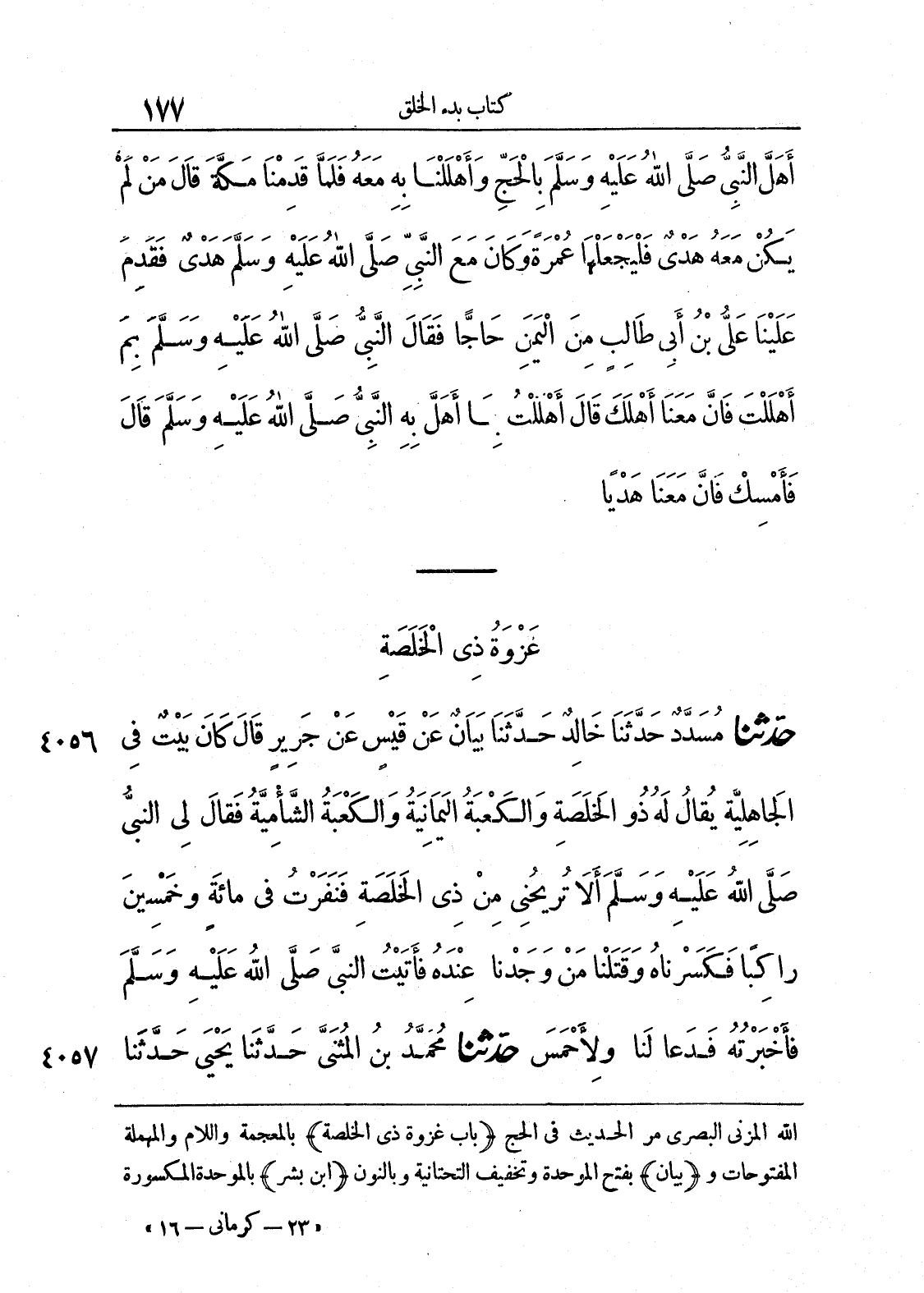 4056 - حَدَّثَنَا مُسَدَّدٌ حَدَّثَنَا خَالِدٌ حَدَّثَنَا بَيَانٌ عَنْ قَيْسٍ عَنْ جَرِيرٍ قَالَ كَان بَيْتٌ فِى الْجَاهِلِيَّةِ يُقَالُ لَهُ ذُو الْخَلَصَةِ وَالْكَعْبَةُ الْيَمَانِيَةُ وَالْكَعْبَةُ الشَّامِيَّةُ، فَقَالَ لِى النَّبِىُّ صلى الله عليه وسلم «أَلاَ تُرِيحُنِى مِنْ ذِى الْخَلَصَةِ». فَنَفَرْتُ فِى مِائَةٍ وَخَمْسِينَ رَاكِباً، فَكَسَرْنَاهُ وَقَتَلْنَا مَنْ وَجَدْنَا عِنْدَهُ، فَأَتَيْتُ النَّبِىَّ صلى الله عليه وسلّم فَأَخْبَرْتُهُ، فَدَعَا لَنَا وَلأَحْمَسَ.