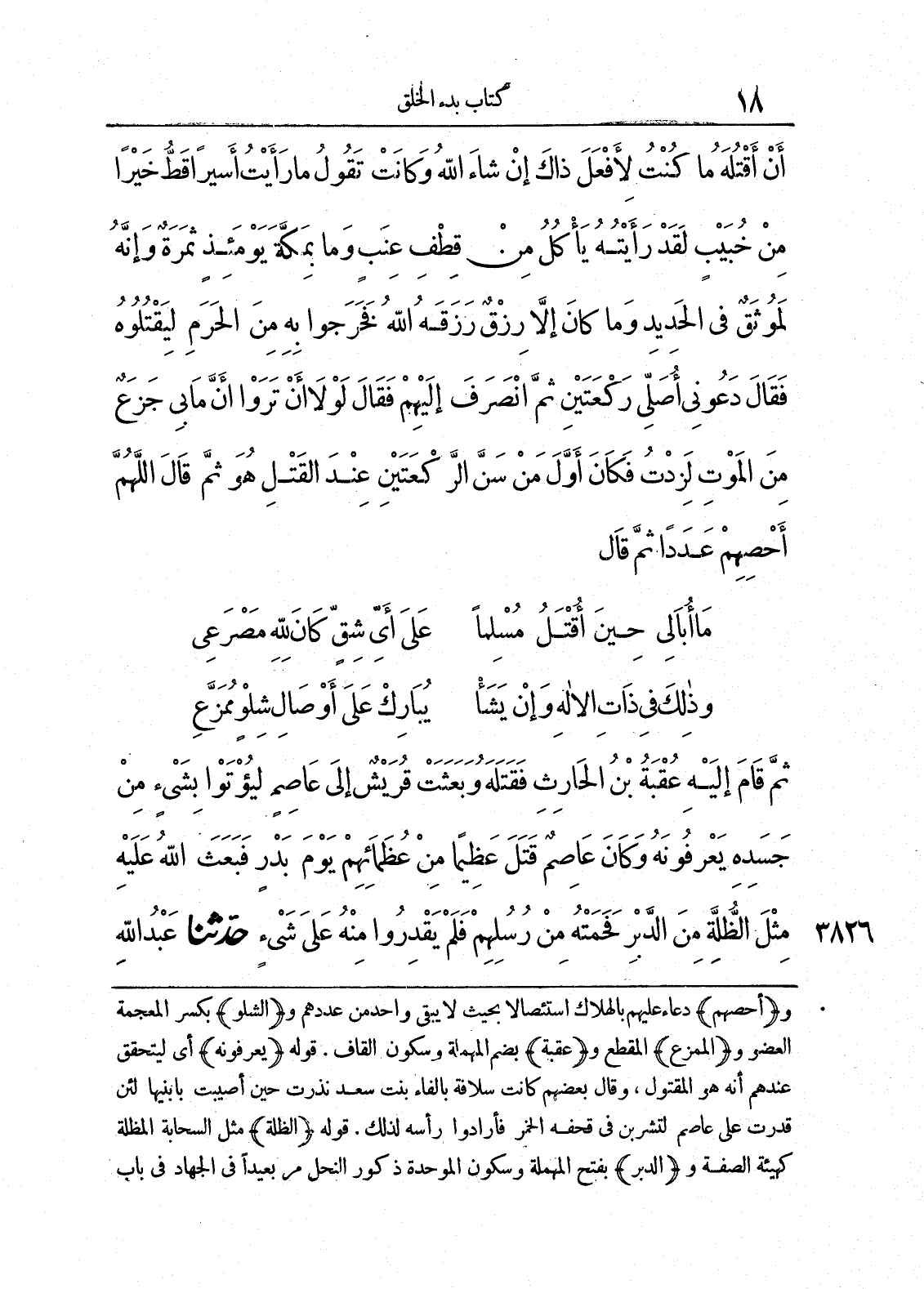 أَنْ أَقْتُلَهُ مَا كُنْتُ لأَفْعَلَ ذَاكِ إِنْ شَاءَ اللَّهُ. وَكَانَتْ تَقُولُ مَا رَأَيْتُ أَسِيراً قَطُّ خَيْراً مِنْ خُبَيْبٍ، لَقَدْ رَأَيْتُهُ يَاكُلُ مِنْ قِطْفِ عِنَبٍ، وَمَا بِمَكَّةَ يَوْمَئِذٍ ثَمَرَةٌ، وَإِنَّهُ لَمُوثَقٌ فِى الْحَدِيدِ، وَمَا كَانَ إِلاَّ رِزْقٌ رَزَقَهُ اللَّهُ، فَخَرَجُوا بِهِ مِنَ الْحَرَمِ، لِيَقْتُلُوهُ فَقَالَ دَعُونِى أُصَلِّى رَكْعَتَيْنِ. ثُمَّ انْصَرَفَ إِلَيْهِمْ فَقَالَ لَوْلاَ أَنْ تَرَوْا أَنَّ مَا بِى جَزَعٌ مِنَ الْمَوْتِ، لَزِدْتُ. فَكَانَ أَوَّلَ مَنْ سَنَّ الرَّكْعَتَيْنِ عِنْدَ الْقَتْلِ هُوَ، ثُمَّ قَالَ اللَّهُمَّ أَحْصِهِمْ عَدَداً ثُمَّ قَالَ