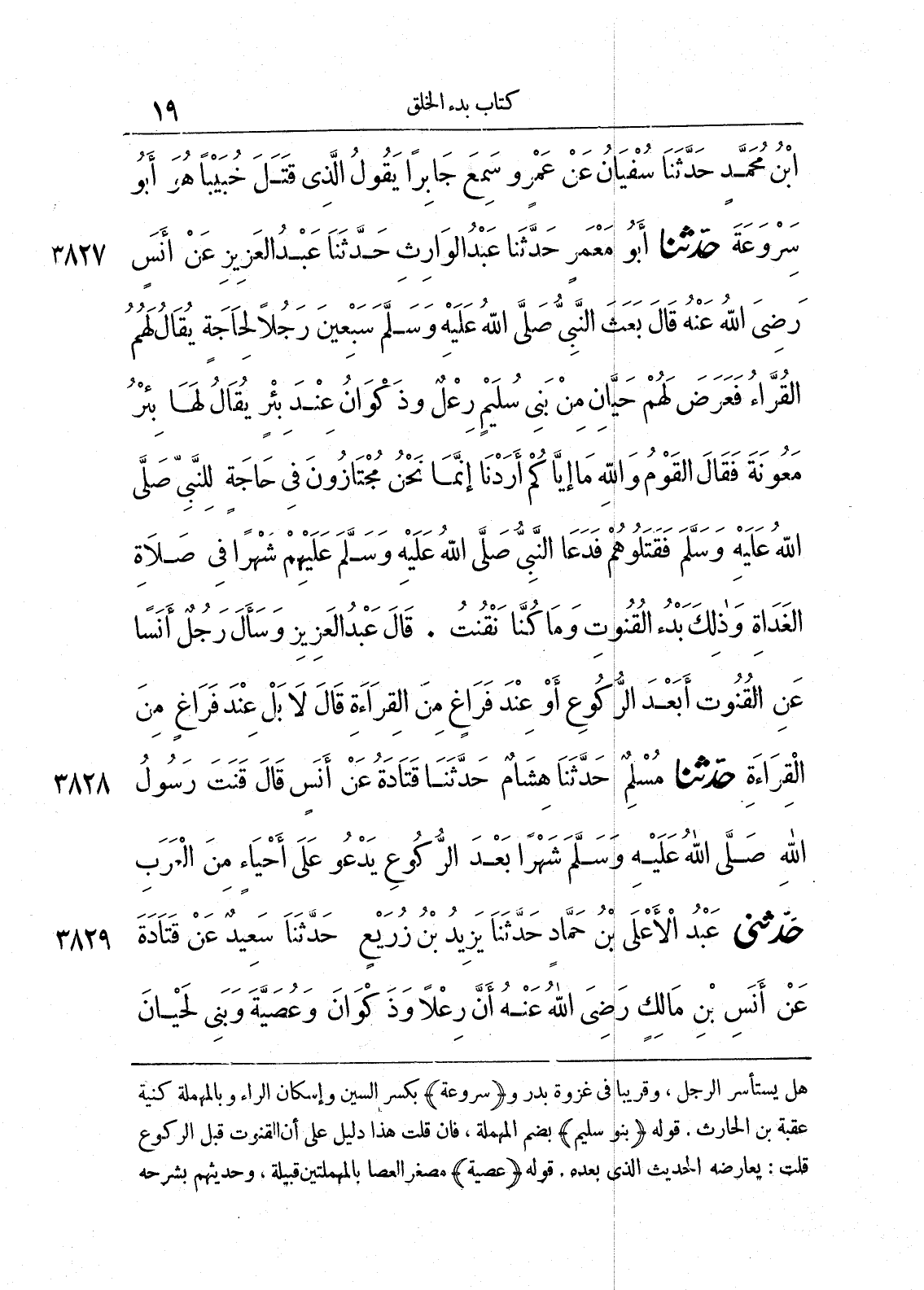 3827 - حَدَّثَنَا أَبُو مَعْمَرٍ حَدَّثَنَا عَبْدُ الْوَارِثِ حَدَّثَنَا عَبْدُ الْعَزِيزِ عَنْ أَنَسٍ - رضى الله عنه - قَالَ بَعَثَ النَّبِىُّ صلى الله عليه وسلّم سَبْعِينَ رَجُلاً لِحَاجَةٍ يُقَالُ لَهُمُ الْقُرَّاءُ، فَعَرَضَ لَهُمْ حَيَّانِ مِنْ بَنِى سُلَيْمٍ رِعْلٌ وَذَكْوَانُ، عِنْدَ بِئْرٍ يُقَالُ لَهَا بِئْرُ مَعُونَةَ، فَقَالَ الْقَوْمُ وَاللَّهِ مَا إِيَّاكُمْ أَرَدْنَا، إِنَّمَا نَحْنُ مُجْتَازُونَ فِى حَاجَةٍ لِلنَّبِىِّ صلى الله عليه وسلّم، فَقَتَلُوهُمْ فَدَعَا النَّبِىُّ صلى الله عليه وسلّم عَلَيْهِمْ شَهْراً فِى صَلاَةِ الْغَدَاةِ، وَذَلِكَ بَدْءُ الْقُنُوتِ وَمَا كُنَّا نَقْنُتُ. قَالَ عَبْدُ الْعَزِيزِ وَسَأَلَ رَجُلٌ أَنَساً عَنِ الْقُنُوتِ أَبَعْدَ الرُّكُوعِ، أَوْ عِنْدَ فَرَاغٍ مِنَ الْقِرَاءَةِ قَالَ لاَ بَلْ عِنْدَ فَرَاغٍ مِنَ الْقِرَاءَةِ.
