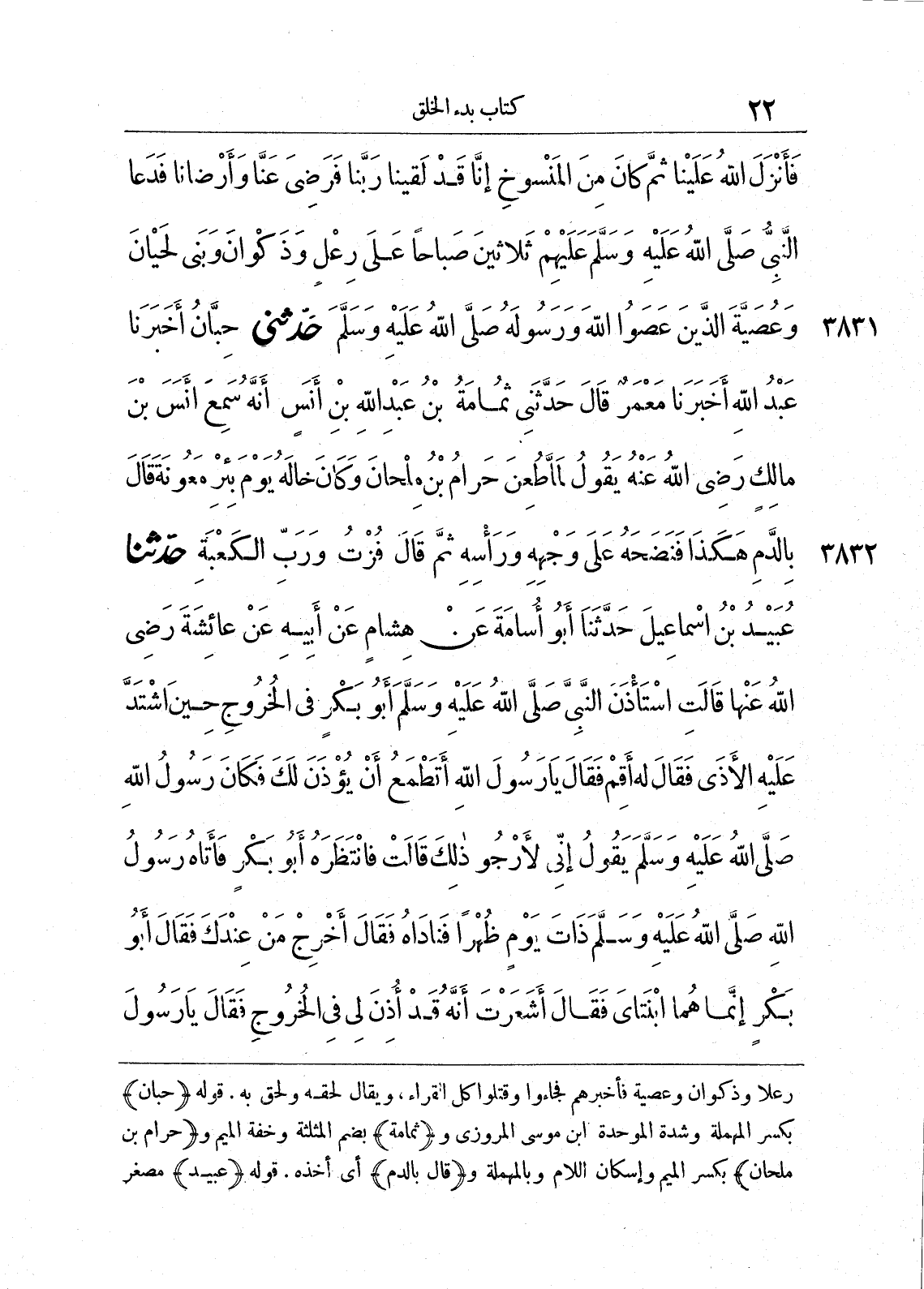 3832 - حَدَّثَنَا عُبَيْدُ بْنُ إِسْمَاعِيلَ حَدَّثَنَا أَبُو أُسَامَةَ عَنْ هِشَامٍ عَنْ أَبِيهِ عَنْ عَائِشَةَ - رضى الله عنها - قَالَتِ اسْتَاذَنَ النَّبِىَّ صلى الله عليه وسلّم أَبُو بَكْرٍ فِى الْخُرُوجِ حِينَ اشْتَدَّ عَلَيْهِ الأَذَى، فَقَالَ لَهُ «أَقِمْ». فَقَالَ يَا رَسُولَ اللَّهِ أَتَطْمَعُ أَنْ يُؤْذَنَ لَكَ، فَكَانَ رَسُولُ اللَّهِ صلى الله عليه وسلّم يَقُولُ «إِنِّى لأَرْجُو ذَلِكَ» قَالَتْ فَانْتَظَرَهُ أَبُو بَكْرٍ فَأَتَاهُ رَسُولُ اللَّهِ صلى الله عليه وسلّم ذَاتَ يَوْمٍ ظُهْراً فَنَادَاهُ فَقَالَ «أَخْرِجْ مَنْ عِنْدَكَ». فَقَالَ أَبُو بَكْرٍ إِنَّمَا هُمَا ابْنَتَاىَ. فَقَالَ «أَشَعَرْتَ أَنَّهُ قَدْ أُذِنَ لِى فِى الْخُرُوجِ». فَقَالَ يَا رَسُولَ