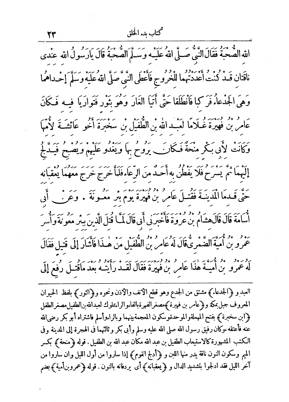 اللَّهِ الصُّحْبَةُ. فَقَالَ النَّبِىُّ صلى الله عليه وسلّم «الصُّحْبَةُ». قَالَ يَا رَسُولَ اللَّهِ عِنْدِى نَاقَتَانِ قَدْ كُنْتُ أَعْدَدْتُهُمَا لِلْخُرُوجِ. فَأَعْطَى النَّبِىَّ صلى الله عليه وسلّم إِحْدَاهُمَا وَهْىَ الْجَدْعَاءُ، فَرَكِبَا فَانْطَلَقَا حَتَّى أَتَيَا الْغَارَ، وَهْوَ بِثَوْرٍ، فَتَوَارَيَا فِيهِ، فَكَانَ عَامِرُ بْنُ فُهَيْرَةَ غُلاَماً لِعَبْدِ اللَّهِ بْنِ الطُّفَيْلِ بْنِ سَخْبَرَةَ أَخُو عَائِشَةَ لأُمِّهَا، وَكَانَتْ لأَبِى بَكْرٍ مِنْحَةٌ، فَكَانَ يَرُوحُ بِهَا وَيَغْدُو عَلَيْهِمْ، وَيُصْبِحُ فَيَدَّلِجُ إِلَيْهِمَا ثُمَّ يَسْرَحُ، فَلاَ يَفْطُنُ بِهِ أَحَدٌ مِنَ الرِّعَاءِ، فَلَمَّا خَرَجَ خَرَجَ مَعَهُمَا يُعْقِبَانِهِ حَتَّى قَدِمَا الْمَدِينَةَ، فَقُتِلَ عَامِرُ بْنُ فُهَيْرَةَ يَوْمَ بِئْرِ مَعُونَةَ. وَعَنْ أَبِى أُسَامَةَ قَالَ قَالَ هِشَامُ بْنُ عُرْوَةَ فَأَخْبَرَنِى أَبِى قَالَ لَمَّا قُتِلَ الَّذِينَ بِبِئْرِ مَعُونَةَ وَأُسِرَ عَمْرُو بْنُ أُمَيَّةَ الضَّمْرِىُّ قَالَ لَهُ عَامِرُ بْنُ الطُّفَيْلِ مَنْ هَذَا فَأَشَارَ إِلَى قَتِيلٍ، فَقَالَ لَهُ عَمْرُو بْنُ أُمَيَّةَ هَذَا عَامِرُ بْنُ فُهَيْرَةَ. فَقَالَ لَقَدْ رَأَيْتُهُ بَعْدَ مَا قُتِلَ رُفِعَ إِلَى