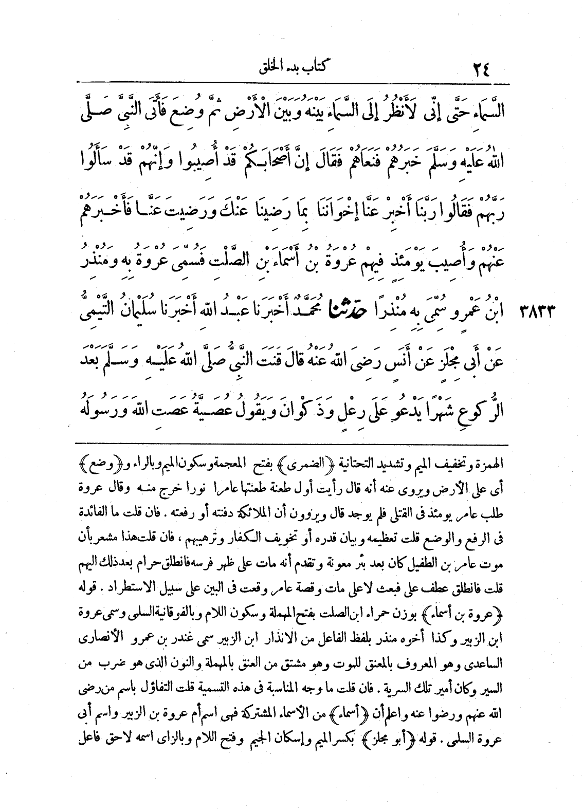 السَّمَاءِ حَتَّى إِنِّى لأَنْظُرُ إِلَى السَّمَاءِ بَيْنَهُ وَبَيْنَ الأَرْضِ، ثُمَّ وُضِعَ. فَأَتَى النَّبِىَّ صلى الله عليه وسلّم خَبَرُهُمْ فَنَعَاهُمْ فَقَالَ «إِنَّ أَصْحَابَكُمْ قَدْ أُصِيبُوا، وَإِنَّهُمْ قَدْ سَأَلُوا رَبَّهُمْ، فَقَالُوا رَبَّنَا أَخْبِرْ عَنَّا إِخْوَانَنَا بِمَا رَضِينَا عَنْكَ وَرَضِيتَ عَنَّا. فَأَخْبَرَهُمْ عَنْهُمْ». وَأُصِيبَ يَوْمَئِذٍ فِيهِمْ عُرْوَةُ بْنُ أَسْمَاءَ بْنِ الصَّلْتِ، فَسُمِّىَ عُرْوَةُ بِهِ، وَمُنْذِرُ بْنُ عَمْرٍو سُمِّىَ بِهِ مُنْذِراً.