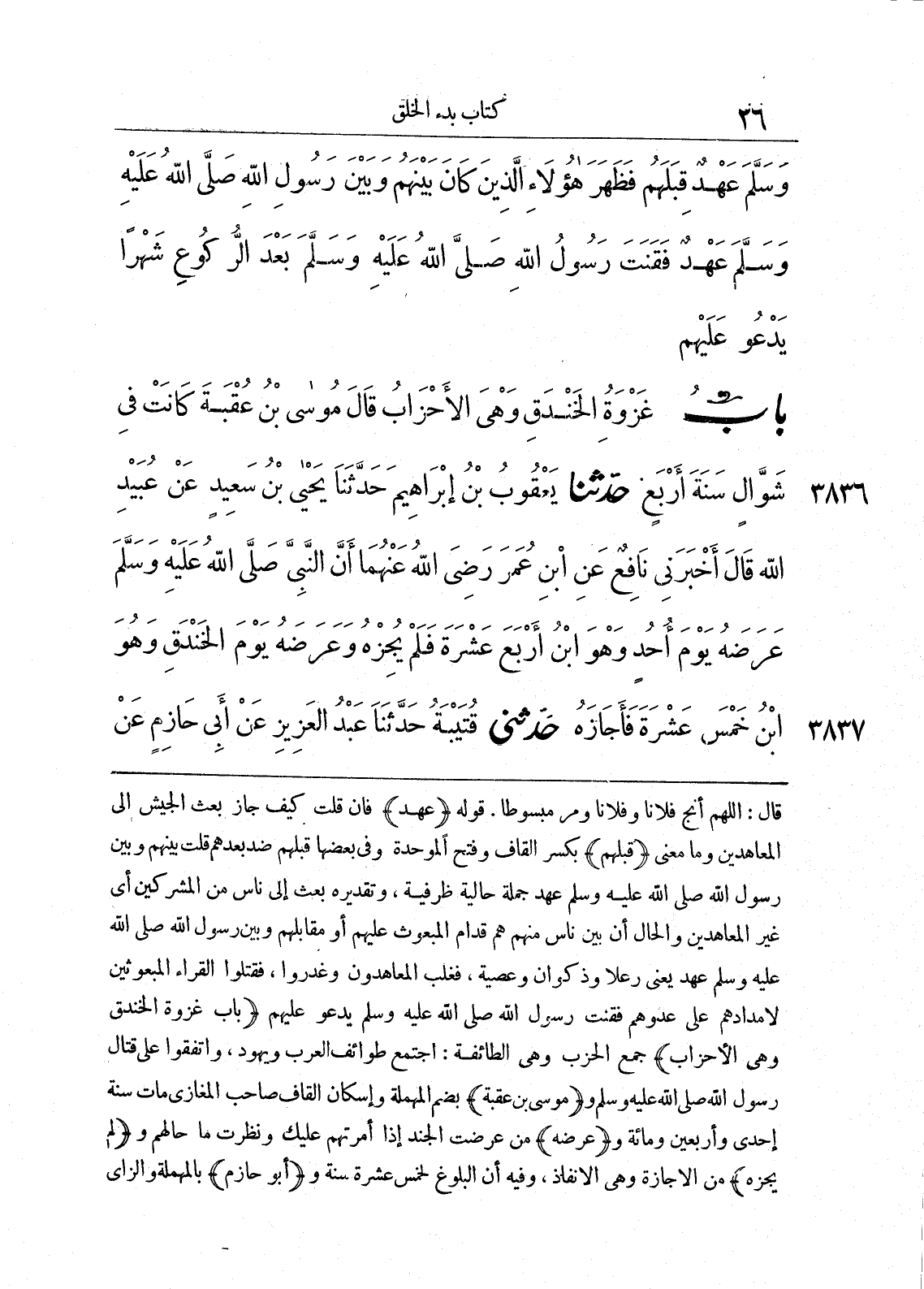 3836 - حَدَّثَنَا يَعْقُوبُ بْنُ إِبْرَاهِيمَ حَدَّثَنَا يَحْيَى بْنُ سَعِيدٍ عَنْ عُبَيْدِ اللَّهِ قَالَ أَخْبَرَنِى نَافِعٌ عَنِ ابْنِ عُمَرَ - رضى الله عنهما أَنَّ النَّبِىَّ صلى الله عليه وسلّم عَرَضَهُ يَوْمَ أُحُدٍ وَهْوَ ابْنُ أَرْبَعَ عَشْرَةَ فَلَمْ يُجِزْهُ، وَعَرَضَهُ يَوْمَ الْخَنْدَقِ وَهْوَ ابْنُ خَمْسَ عَشْرَةَ فَأَجَازَهُ.