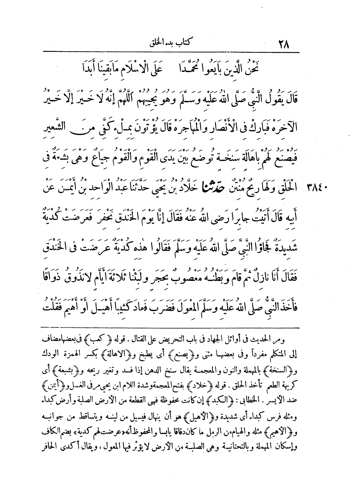 ومر الحديث في أوائل الجهاد في باب التحريض على القتال. قوله) كعب (في بعضها مضاف إلى المتكلم مفردا وفي بعضها مثنى ويصنع أي يطبخ والإهالة بكسر الهمزة الودك والسنخة بالمهملة والنون والمعجمة يقال سنخ الدهن إذا فسد وتغير ريحه وبشبعة أي كريهة الطعم تاخد الحلق. قوله خلاد (بفتح المعجمة وشدة اللام ابن يحيى مر في الغسل و) أيمن (ضد الايسر. الخطابي:) الكبد (أن كانت محفوظة فهي القطعة من الأرض الصلبة وارض كبداء أي شديدة و) الأهيل (هو أن ينهال فيسيل من لينه ويتساقط من جوانبه و) الاهيم (مثله والهيام من الرمل ما كان دقاقا يابسا والمحفوظ) انه عرضت لهم كدية (بضم الكاف وإسكان المهملة وبالتحتانية وهي الصلبة من الأرض لا يؤثر فيها المعول، ويقال أكدى الحافر