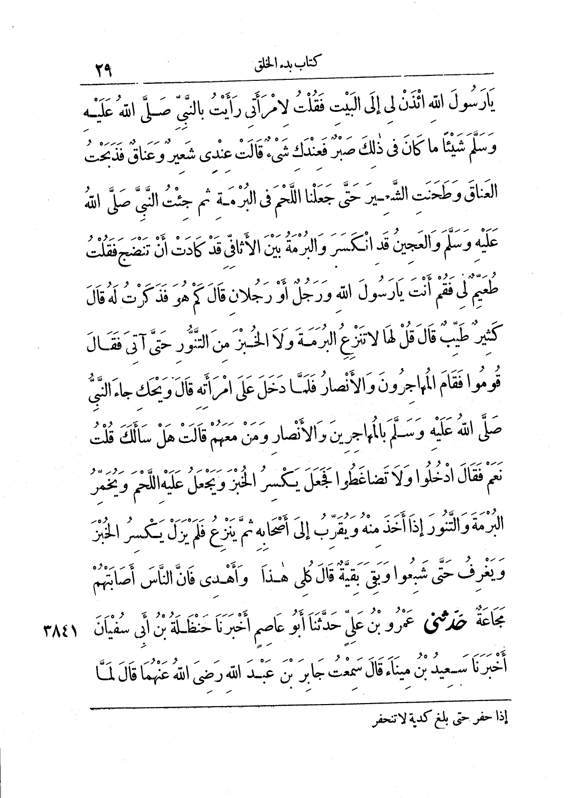 يَا رَسُولَ اللَّهِ ائْذَنْ لِى إِلَى الْبَيْتِ. فَقُلْتُ لاِمْرَأَتِى رَأَيْتُ بِالنَّبِىِّ صلى الله عليه وسلّم شَيْئاً، مَا كَانَ فِى ذَلِكَ صَبْرٌ، فَعِنْدَكِ شَىْءٌ قَالَتْ عِنْدِى شَعِيرٌ وَعَنَاقٌ. فَذَبَحْتُ الْعَنَاقَ وَطَحَنَتِ الشَّعِيرَ، حَتَّى جَعَلْنَا اللَّحْمَ فِى الْبُرْمَةِ، ثُمَّ جِئْتُ النَّبِىَّ صلى الله عليه وسلّم وَالْعَجِينُ قَدِ انْكَسَرَ، وَالْبُرْمَةُ بَيْنَ الأَثَافِىِّ قَدْ كَادَتْ أَنْ تَنْضَجَ فَقُلْتُ طُعَيِّمٌ لِى، فَقُمْ أَنْتَ يَا رَسُولَ اللَّهِ وَرَجُلٌ أَوْ رَجُلاَنِ. قَالَ «كَمْ هُوَ». فَذَكَرْتُ لَهُ، قَالَ «كَثِيرٌ طَيِّبٌ». قَالَ «قُلْ لَهَا لاَ تَنْزِعُ الْبُرْمَةَ وَلاَ الْخُبْزَ مِنَ التَّنُّورِ حَتَّى آتِىَ». فَقَالَ «قُومُوا». فَقَامَ الْمُهَاجِرُونَ وَالأَنْصَارُ، فَلَمَّا دَخَلَ عَلَى امْرَأَتِهِ قَالَ وَيْحَكِ جَاءَ النَّبِىُّ صلى الله عليه وسلّم بِالْمُهَاجِرِينَ وَالأَنْصَارِ وَمَنْ مَعَهُمْ. قَالَتْ هَلْ سَأَلَكَ قُلْتُ نَعَمْ. فَقَالَ «ادْخُلُوا وَلاَ تَضَاغَطُوا». فَجَعَلَ يَكْسِرُ الْخُبْزَ وَيَجْعَلُ عَلَيْهِ اللَّحْمَ، وَيُخَمِّرُ الْبُرْمَةَ وَالتَّنُّورَ إِذَا أَخَذَ مِنْهُ، وَيُقَرِّبُ إِلَى أَصْحَابِهِ ثُمَّ يَنْزِعُ، فَلَمْ يَزَلْ يَكْسِرُ الْخُبْزَ وَيَغْرِفُ حَتَّى شَبِعُوا وَبَقِىَ بَقِيَّةٌ قَالَ «كُلِى هَذَا وَأَهْدِى، فَإِنَّ النَّاسَ أَصَابَتْهُمْ مَجَاعَةٌ».