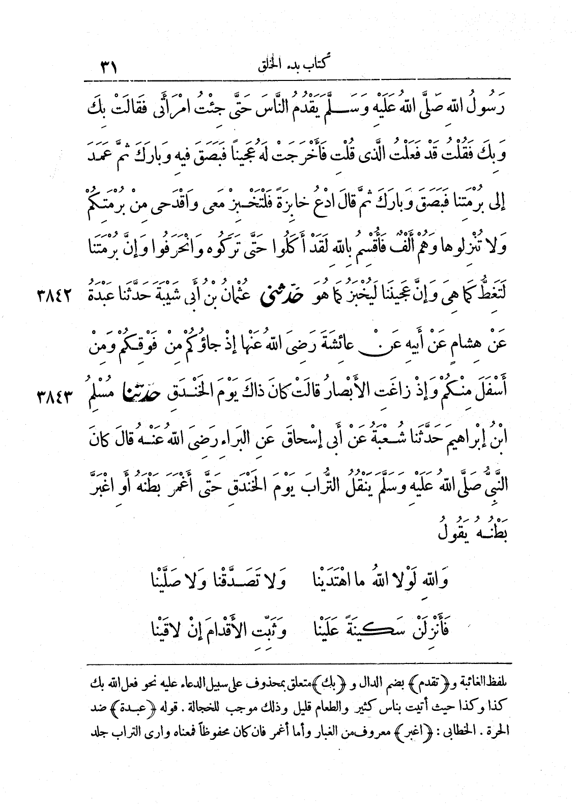 3843 - حَدَّثَنَا مُسْلِمُ بْنُ إِبْرَاهِيمَ حَدَّثَنَا شُعْبَةُ عَنْ أَبِى إِسْحَاقَ عَنِ الْبَرَاءِ - رضى الله عنه - قَالَ كَانَ النَّبِىُّ صلى الله عليه وسلّم يَنْقُلُ التُّرَابَ يَوْمَ الْخَنْدَقِ حَتَّى أَغْمَرَ بَطْنَهُ أَوِ اغْبَرَّ بَطْنُهُ يَقُولُ