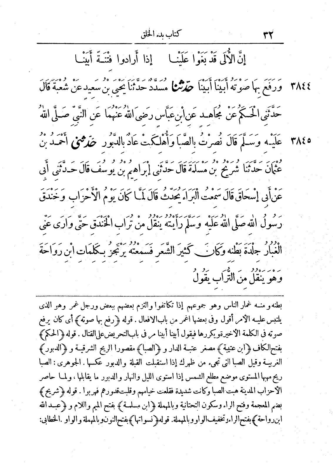3845 - حَدَّثَنِى أَحْمَدُ بْنُ عُثْمَانَ حَدَّثَنَا شُرَيْحُ بْنُ مَسْلَمَةَ قَالَ حَدَّثَنِى إِبْرَاهِيمُ بْنُ يُوسُفَ قَالَ حَدَّثَنِى أَبِى عَنْ أَبِى إِسْحَاقَ قَالَ سَمِعْتُ الْبَرَاءَ يُحَدِّثُ قَالَ لَمَّا كَانَ يَوْمُ الأَحْزَابِ، وَخَنْدَقَ رَسُولُ اللَّهِ صلى الله عليه وسلّم رَأَيْتُهُ يَنْقُلُ مِنْ تُرَابِ الْخَنْدَقِ حَتَّى وَارَى عَنِّى الْغُبَارُ جِلْدَةَ بَطْنِهِ، وَكَانَ كَثِيرَ الشَّعَرِ، فَسَمِعْتُهُ يَرْتَجِزُ بِكَلِمَاتِ ابْنِ رَوَاحَةَ، وَهْوَ يَنْقُلُ مِنَ التُّرَابِ يَقُولُ
