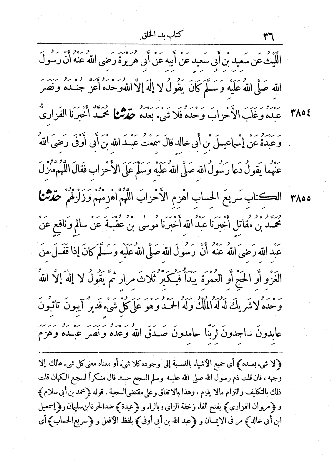 3855 - حَدَّثَنَا مُحَمَّدُ بْنُ مُقَاتِلٍ أَخْبَرَنَا عَبْدُ اللَّهِ أَخْبَرَنَا مُوسَى بْنُ عُقْبَةَ عَنْ سَالِمٍ وَنَافِعٍ عَنْ عَبْدِ اللَّهِ - رضى الله عنه - أَنَّ رَسُولَ اللَّهِ صلى الله عليه وسلّم كَانَ إِذَا قَفَلَ مِنَ الْغَزْوِ، أَوِ الْحَجِّ، أَوِ الْعُمْرَةِ، يَبْدَأُ فَيُكَبِّرُ ثَلاَثَ مِرَارٍ ثُمَّ يَقُولُ «لاَ إِلَهَ إِلاَّ اللَّهُ وَحْدَهُ لاَ شَرِيكَ لَهُ، لَهُ الْمُلْكُ وَلَهُ الْحَمْدُ، وَهْوَ عَلَى كُلِّ شَىْءٍ قَدِيرٌ، آيِبُونَ تَائِبُونَ عَابِدُونُ سَاجِدُونَ، لِرَبِّنَا حَامِدُونَ، صَدَقَ اللَّهُ وَعْدَهُ، وَنَصَرَ عَبْدَهُ، وَهَزَمَ
