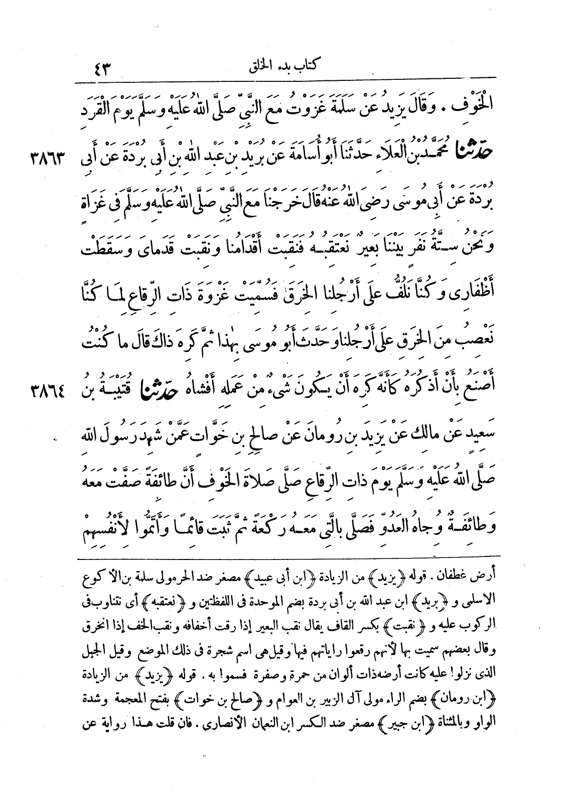 3863 - حَدَّثَنَا مُحَمَّدُ بْنُ الْعَلاَءِ حَدَّثَنَا أَبُو أُسَامَةَ عَنْ بُرَيْدِ بْنِ عَبْدِ اللَّهِ بْنِ أَبِى بُرْدَةَ عَنْ أَبِى بُرْدَةَ عَنْ أَبِى مُوسَى - رضى الله عنه - قَالَ خَرَجْنَا مَعَ النَّبِىِّ صلى الله عليه وسلّم فِى غَزَاةٍ وَنَحْنُ سِتَّةُ نَفَرٍ بَيْنَنَا بَعِيرٌ نَعْتَقِبُهُ، فَنَقِبَتْ أَقْدَامُنَا وَنَقِبَتْ قَدَمَاىَ وَسَقَطَتْ أَظْفَارِى، وَكُنَّا نَلُفُّ عَلَى أَرْجُلِنَا الْخِرَقَ، فَسُمِّيَتْ غَزْوَةَ ذَاتِ الرِّقَاعِ، لِمَا كُنَّا نَعْصِبُ مِنَ الْخِرَقِ عَلَى أَرْجُلِنَا، وَحَدَّثَ أَبُو مُوسَى بِهَذَا، ثُمَّ كَرِهَ ذَاكَ، قَالَ مَا كُنْتُ أَصْنَعُ بِأَنْ أَذْكُرَهُ. كَأَنَّهُ كَرِهَ أَنْ يَكُونَ شَىْءٌ مِنْ عَمَلِهِ أَفْشَاهُ.