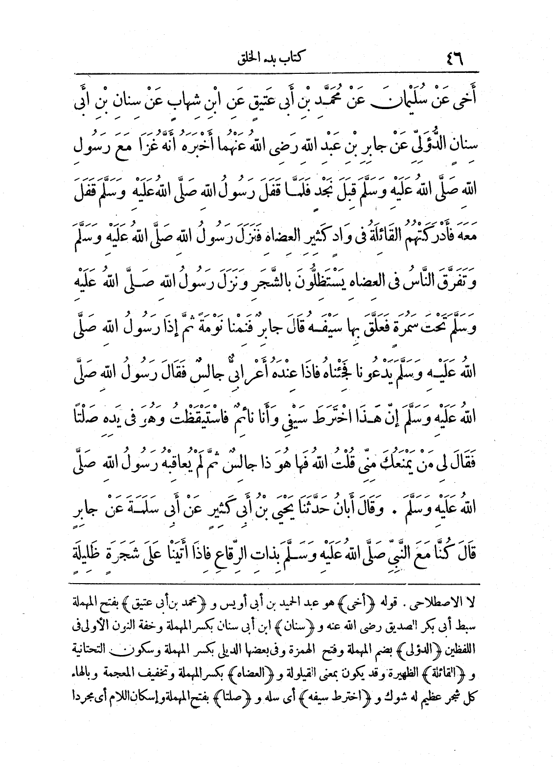 أَخِى عَنْ سُلَيْمَانَ عَنْ مُحَمَّدِ بْنِ أَبِى عَتِيقٍ عَنِ ابْنِ شِهَابٍ عَنْ سِنَانِ بْنِ أَبِى سِنَانٍ الدُّؤَلِىِّ عَنْ جَابِرِ بْنِ عَبْدِ اللَّهِ - رضى الله عنهما - أَخْبَرَهُ أَنَّهُ غَزَا مَعَ رَسُولِ اللَّهِ صلى الله عليه وسلّم قِبَلَ نَجْدٍ، فَلَمَّا قَفَلَ رَسُولُ اللَّهِ صلى الله عليه وسلّم قَفَلَ مَعَهُ، فَأَدْرَكَتْهُمُ الْقَائِلَةُ فِى وَادٍ كَثِيرِ الْعِضَاهِ، فَنَزَلَ رَسُولُ اللَّهِ صلى الله عليه وسلّم، وَتَفَرَّقَ النَّاسُ فِى الْعِضَاهِ يَسْتَظِلُّونَ بِالشَّجَرِ، وَنَزَلَ رَسُولُ اللَّهِ صلى الله عليه وسلّم تَحْتَ سَمُرَةٍ، فَعَلَّقَ بِهَا سَيْفَهُ، قَالَ جَابِرٌ فَنِمْنَا نَوْمَةً، ثُمَّ إِذَا رَسُولُ اللَّهِ صلى الله عليه وسلّم يَدْعُونَا، فَجِئْنَاهُ فَإِذَا عِنْدَهُ أَعْرَابِىٌّ جَالِسٌ فَقَالَ رَسُولُ اللَّهِ صلى الله عليه وسلّم «إِنَّ هَذَا اخْتَرَطَ سَيْفِى، وَأَنَا نَائِمٌ فَاسْتَيْقَظْتُ، وَهْوَ فِى يَدِهِ صَلْتاً، فَقَالَ لِى مَنْ يَمْنَعُكَ مِنِّى قُلْتُ اللَّهُ. فَهَا هُوَ ذَا جَالِسٌ». ثُمَّ لَمْ يُعَاقِبْهُ رَسُولُ اللَّهِ صلى الله عليه وسلّم. وَقَالَ أَبَانُ حَدَّثَنَا يَحْيَى بْنُ أَبِى كَثِيرٍ عَنْ أَبِى سَلَمَةَ عَنْ جَابِرٍ قَالَ كُنَّا مَعَ النَّبِىِّ صلى الله عليه وسلّم بِذَاتِ الرِّقَاعِ، فَإِذَا أَتَيْنَا عَلَى شَجَرَةٍ ظَلِيلَةٍ