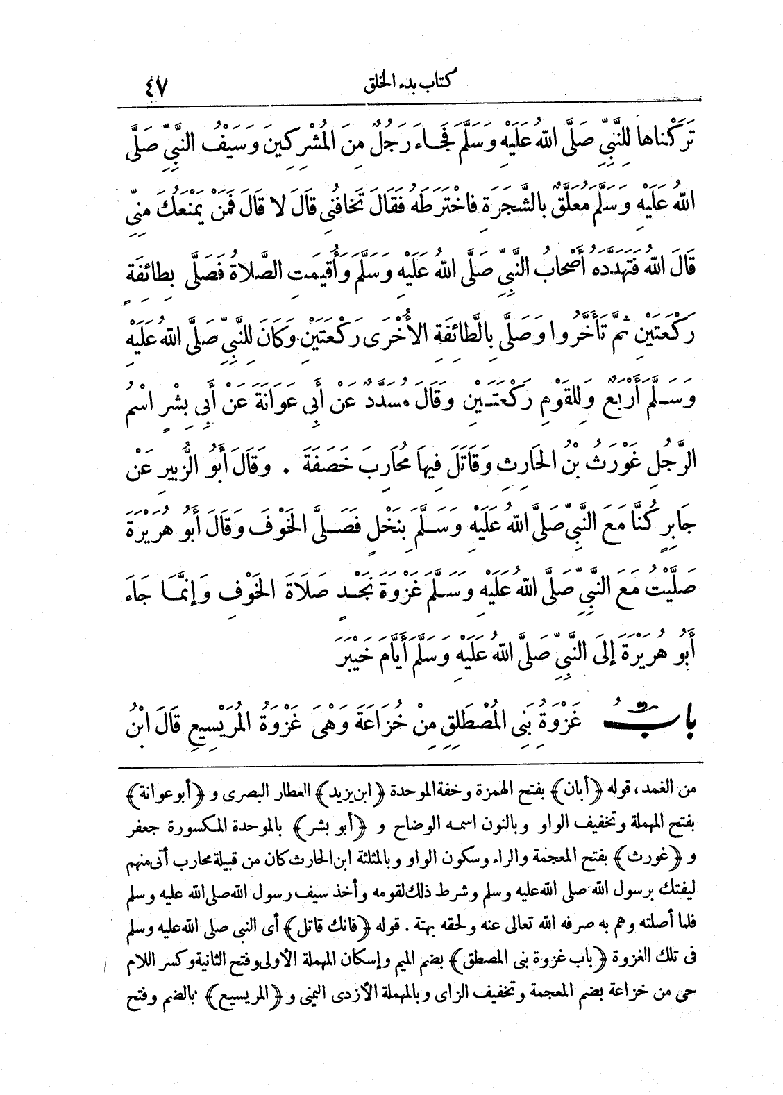 تَرَكْنَاهَا لِلنَّبِىِّ صلى الله عليه وسلّم، فَجَاءَ رَجُلٌ مِنَ الْمُشْرِكِينَ وَسَيْفُ النَّبِىِّ صلى الله عليه وسلّم مُعَلَّقٌ بِالشَّجَرَةِ فَاخْتَرَطَهُ فَقَالَ تَخَافُنِى قَالَ «لاَ». قَالَ فَمَنْ يَمْنَعُكَ مِنِّى قَالَ «اللَّهُ». فَتَهَدَّدَهُ أَصْحَابُ النَّبِىِّ صلى الله عليه وسلّم، وَأُقِيمَتِ الصَّلاَةُ فَصَلَّى بِطَائِفَةٍ رَكْعَتَيْنِ، ثُمَّ تَأَخَّرُوا، وَصَلَّى بِالطَّائِفَةِ الأُخْرَى رَكْعَتَيْنِ، وَكَانَ لِلنَّبِىِّ صلى الله عليه وسلّم أَرْبَعٌ وَلِلْقَوْمِ رَكْعَتَيْنِ. وَقَالَ مُسَدَّدٌ عَنْ أَبِى عَوَانَةَ عَنْ أَبِى بِشْرٍ اسْمُ الرَّجُلِ غَوْرَثُ بْنُ الْحَارِثِ، وَقَاتَلَ فِيهَا مُحَارِبَ خَصَفَةَ. وَقَالَ أَبُو الزُّبَيْرِ عَنْ جَابِرٍ كُنَّا مَعَ النَّبِىِّ صلى الله عليه وسلّم بِنَخْلٍ فَصَلَّى الْخَوْفَ. وَقَالَ أَبُو هُرَيْرَةَ صَلَّيْتُ مَعَ النَّبِىِّ صلى الله عليه وسلّم غَزْوَةَ نَجْدٍ صَلاَةَ الْخَوْفِ. وَإِنَّمَا جَاءَ أَبُو هُرَيْرَةَ إِلَى النَّبِىِّ صلى الله عليه وسلّم أَيَّامَ خَيْبَرَ.
