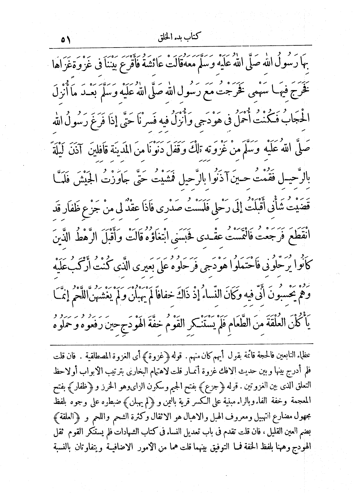 بِهَا رَسُولُ اللَّهِ صلى الله عليه وسلّم مَعَهُ، قَالَتْ عَائِشَةُ فَأَقْرَعَ بَيْنَنَا فِى غَزْوَةٍ غَزَاهَا فَخَرَجَ فِيهَا سَهْمِى، فَخَرَجْتُ مَعَ رَسُولِ اللَّهِ صلى الله عليه وسلم بَعْدَ مَا أُنْزِلَ الْحِجَابُ، فَكُنْتُ أُحْمَلُ فِى هَوْدَجِى وَأُنْزَلُ فِيهِ، فَسِرْنَا حَتَّى إِذَا فَرَغَ رَسُولُ اللَّهِ صلى الله عليه وسلّم مِنْ غَزْوَتِهِ تِلْكَ وَقَفَلَ، دَنَوْنَا مِنَ الْمَدِينَةِ قَافِلِينَ، آذَنَ لَيْلَةً بِالرَّحِيلِ، فَقُمْتُ حِينَ آذَنُوا بِالرَّحِيلِ فَمَشَيْتُ حَتَّى جَاوَزْتُ الْجَيْشَ، فَلَمَّا قَضَيْتُ شَانِى أَقْبَلْتُ إِلَى رَحْلِى، فَلَمَسْتُ صَدْرِى، فَإِذَا عِقْدٌ لِى مِنْ جَزْعِ ظَفَارِ قَدِ انْقَطَعَ، فَرَجَعْتُ فَالْتَمَسْتُ عِقْدِى، فَحَبَسَنِى ابْتِغَاؤُهُ، قَالَتْ وَأَقْبَلَ الرَّهْطُ الَّذِينَ كَانُوا يُرَحِّلُونِى فَاحْتَمَلُوا هَوْدَجِى، فَرَحَلُوهُ عَلَى بَعِيرِى الَّذِى كُنْتُ أَرْكَبُ عَلَيْهِ، وَهُمْ يَحْسِبُونَ أَنِّى فِيهِ، وَكَانَ النِّسَاءُ إِذْ ذَاكَ خِفَافاً لَمْ يَهْبُلْنَ وَلَمْ يَغْشَهُنَّ اللَّحْمُ، إِنَّمَا يَاكُلْنَ الْعُلْقَةَ مِنَ الطَّعَامِ، فَلَمْ يَسْتَنْكِرِ الْقَوْمُ خِفَّةَ الْهَوْدَجِ حِينَ رَفَعُوهُ وَحَمَلُوهُ،