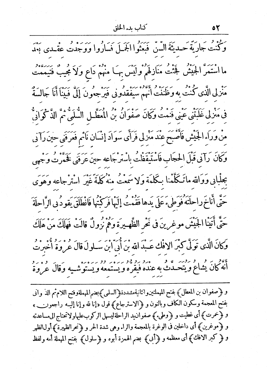 وَكُنْتُ جَارِيَةً حَدِيثَةَ السِّنِّ، فَبَعَثُوا الْجَمَلَ فَسَارُوا، وَوَجَدْتُ عِقْدِى بَعْدَ مَا اسْتَمَرَّ الْجَيْشُ، فَجِئْتُ مَنَازِلَهُمْ وَلَيْسَ بِهَا مِنْهُمْ دَاعٍ وَلاَ مُجِيبٌ، فَتَيَمَّمْتُ مَنْزِلِى الَّذِى كُنْتُ بِهِ، وَظَنَنْتُ أَنَّهُمْ سَيَفْقِدُونِى فَيَرْجِعُونَ إِلَىَّ، فَبَيْنَا أَنَا جَالِسَةٌ فِى مَنْزِلِى غَلَبَتْنِى عَيْنِى فَنِمْتُ، وَكَانَ صَفْوَانُ بْنُ الْمُعَطَّلِ السُّلَمِىُّ ثُمَّ الذَّكْوَانِىُّ مِنْ وَرَاءِ الْجَيْشِ، فَأَصْبَحَ عِنْدَ مَنْزِلِى فَرَأَى سَوَادَ إِنْسَانٍ نَائِمٍ، فَعَرَفَنِى حِينَ رَآنِى، وَكَانَ رَآنِى قَبْلَ الْحِجَابِ، فَاسْتَيْقَظْتُ بِاسْتِرْجَاعِهِ حِينَ عَرَفَنِى، فَخَمَّرْتُ وَجْهِى بِجِلْبَابِى، وَاللَّهِ مَا تَكَلَّمْنَا بِكَلِمَةٍ وَلاَ سَمِعْتُ مِنْهُ كَلِمَةً غَيْرَ اسْتِرْجَاعِهِ، وَهَوَى حَتَّى أَنَاخَ رَاحِلَتَهُ، فَوَطِئَ عَلَى يَدِهَا، فَقُمْتُ إِلَيْهَا فَرَكِبْتُهَا، فَانْطَلَقَ يَقُودُ بِى الرَّاحِلَةَ حَتَّى أَتَيْنَا الْجَيْشَ مُوغِرِينَ فِى نَحْرِ الظَّهِيرَةِ، وَهُمْ نُزُولٌ - قَالَتْ - فَهَلَكَ {فِىَّ} مَنْ هَلَكَ، وَكَانَ الَّذِى تَوَلَّى كِبْرَ الإِفْكِ عَبْدَ اللَّهِ بْنَ أُبَىٍّ ابْنَ سَلُولَ. قَالَ عُرْوَةُ أُخْبِرْتُ أَنَّهُ كَانَ يُشَاعُ وَيُتَحَدَّثُ بِهِ عِنْدَهُ، فَيُقِرُّهُ وَيَسْتَمِعُهُ وَيَسْتَوْشِيهِ. وَقَالَ عُرْوَةُ