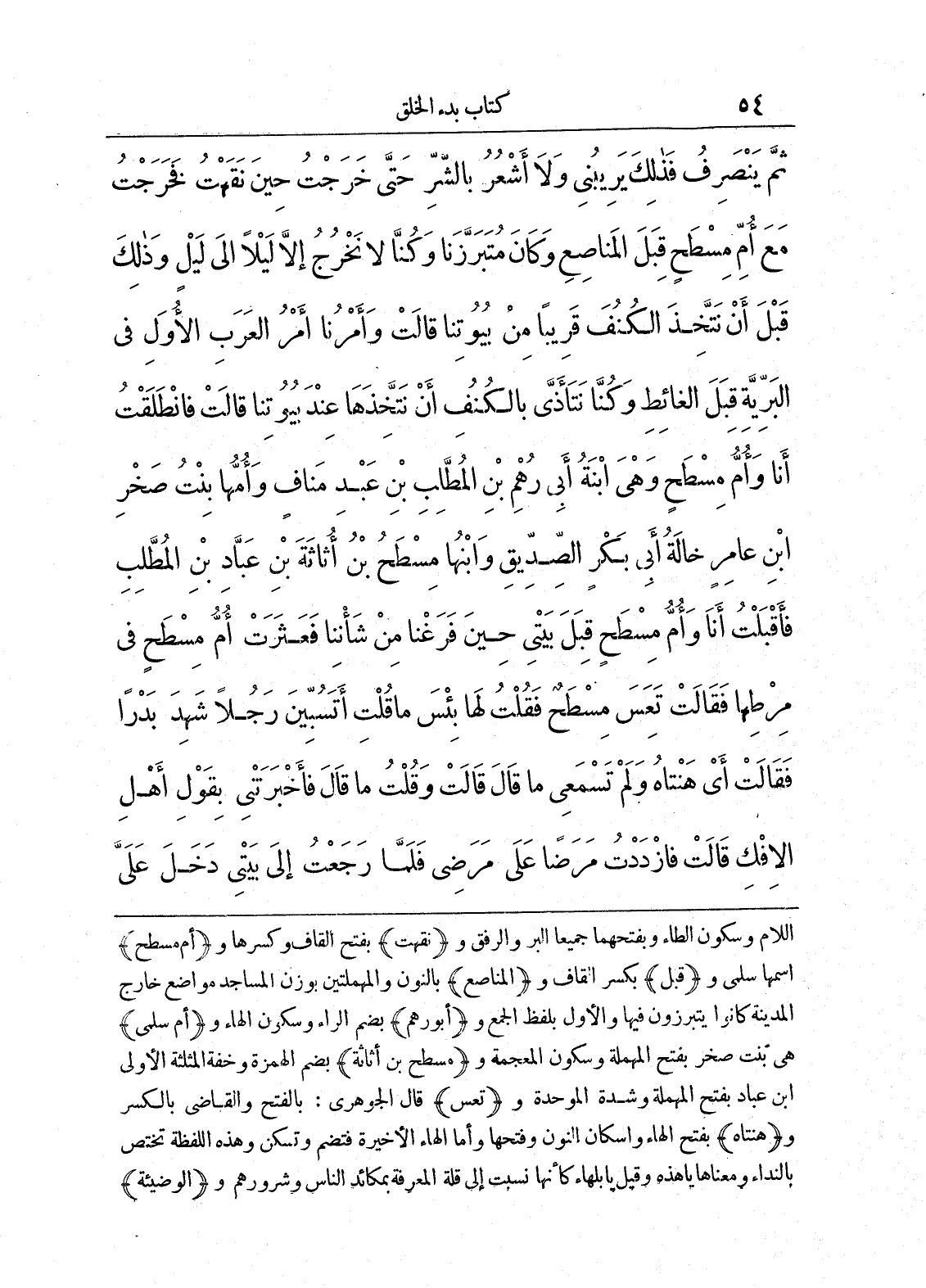 ثُمَّ يَنْصَرِفُ، فَذَلِكَ يَرِيبُنِى وَلاَ أَشْعُرُ بِالشَّرِّ، حَتَّى خَرَجْتُ حِينَ نَقَهْتُ، فَخَرَجْتُ مَعَ أُمِّ مِسْطَحٍ قِبَلَ الْمَنَاصِعِ، وَكَانَ مُتَبَرَّزَنَا، وَكُنَّا لاَ نَخْرُجُ إِلاَّ لَيْلاً إِلَى لَيْلٍ، وَذَلِكَ قَبْلَ أَنْ نَتَّخِذَ الْكُنُفَ قَرِيباً مِنْ بُيُوتِنَا. قَالَتْ وَأَمْرُنَا أَمْرُ الْعَرَبِ الأُوَلِ فِى الْبَرِّيَّةِ قِبَلَ الْغَائِطِ، وَكُنَّا نَتَأَذَّى بِالْكُنُفِ أَنْ نَتَّخِذَهَا عِنْدَ بُيُوتِنَا، قَالَتْ فَانْطَلَقْتُ أَنَا وَأُمُّ مِسْطَحٍ وَهْىَ ابْنَةُ أَبِى رُهْمِ بْنِ الْمُطَّلِبِ بْنِ عَبْدِ مَنَافٍ، وَأُمُّهَا بِنْتُ صَخْرِ بْنِ عَامِرٍ خَالَةُ أَبِى بَكْرٍ الصِّدِّيقِ، وَابْنُهَا مِسْطَحُ بْنُ أُثَاثَةَ بْنِ عَبَّادِ بْنِ الْمُطَّلِبِ، فَأَقْبَلْتُ أَنَا وَأُمُّ مِسْطَحٍ قِبَلَ بَيْتِى، حِينَ فَرَغْنَا مِنْ شَانِنَا، فَعَثَرَتْ أُمُّ مِسْطَحٍ فِى مِرْطِهَا فَقَالَتْ تَعِسَ مِسْطَحٌ. فَقُلْتُ لَهَا بِئْسَ مَا قُلْتِ، أَتَسُبِّينَ رَجُلاً شَهِدَ بَدْراً فَقَالَتْ أَىْ هَنْتَاهْ وَلَمْ تَسْمَعِى مَا قَالَ قَالَتْ وَقُلْتُ مَا قَالَ فَأَخْبَرَتْنِى بِقَوْلِ أَهْلِ الإِفْكِ - قَالَتْ - فَازْدَدْتُ مَرَضاً عَلَى مَرَضِى، فَلَمَّا رَجَعْتُ إِلَى بَيْتِى دَخَلَ عَلَىَّ