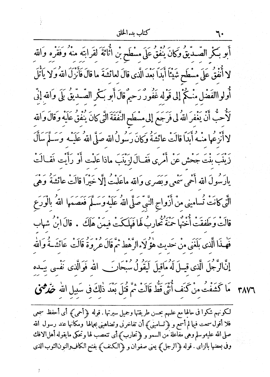 أَبُو بَكْرٍ الصِّدِّيقُ - وَكَانَ يُنْفِقُ عَلَى مِسْطَحِ بْنِ أُثَاثَةَ لِقَرَابَتِهِ مِنْهُ وَفَقْرِهِ - وَاللَّهِ لاَ أُنْفِقُ عَلَى مِسْطَحٍ شَيْئاً أَبَداً بَعْدَ الَّذِى قَالَ لِعَائِشَةَ مَا قَالَ. فَأَنْزَلَ اللَّهُ (وَلاَ يَاتَلِ أُولُو الْفَضْلِ مِنْكُمْ) إِلَى قَوْلِهِ (غَفُورٌ رَحِيمٌ) قَالَ أَبُو بَكْرٍ الصِّدِّيقُ بَلَى وَاللَّهِ إِنِّى لأُحِبُّ أَنْ يَغْفِرَ اللَّهُ لِى. فَرَجَعَ إِلَى مِسْطَحٍ النَّفَقَةَ الَّتِى كَانَ يُنْفِقُ عَلَيْهِ وَقَالَ وَاللَّهِ لاَ أَنْزِعُهَا مِنْهُ أَبَداً. قَالَتْ عَائِشَةُ وَكَانَ رَسُولُ اللَّهِ صلى الله عليه وسلّم سَأَلَ زَيْنَبَ بِنْتَ جَحْشٍ عَنْ أَمْرِى، فَقَالَ لِزَيْنَبَ «مَاذَا عَلِمْتِ أَوْ رَأَيْتِ». فَقَالَتْ يَا رَسُولَ اللَّهِ أَحْمِى سَمْعِى وَبَصَرِى، وَاللَّهِ مَا عَلِمْتُ إِلاَّ خَيْراً. قَالَتْ عَائِشَةُ وَهْىَ الَّتِى كَانَتْ تُسَامِينِى مِنْ أَزْوَاجِ النَّبِىِّ صلى الله عليه وسلّم. فَعَصَمَهَا اللَّهُ بِالْوَرَعِ - قَالَتْ - وَطَفِقَتْ أُخْتُهَا حَمْنَةُ تُحَارِبُ لَهَا، فَهَلَكَتْ فِيمَنْ هَلَكَ. قَالَ ابْنُ شِهَابٍ فَهَذَا الَّذِى بَلَغَنِى مِنْ حَدِيثِ هَؤُلاَءِ الرَّهْطِ.