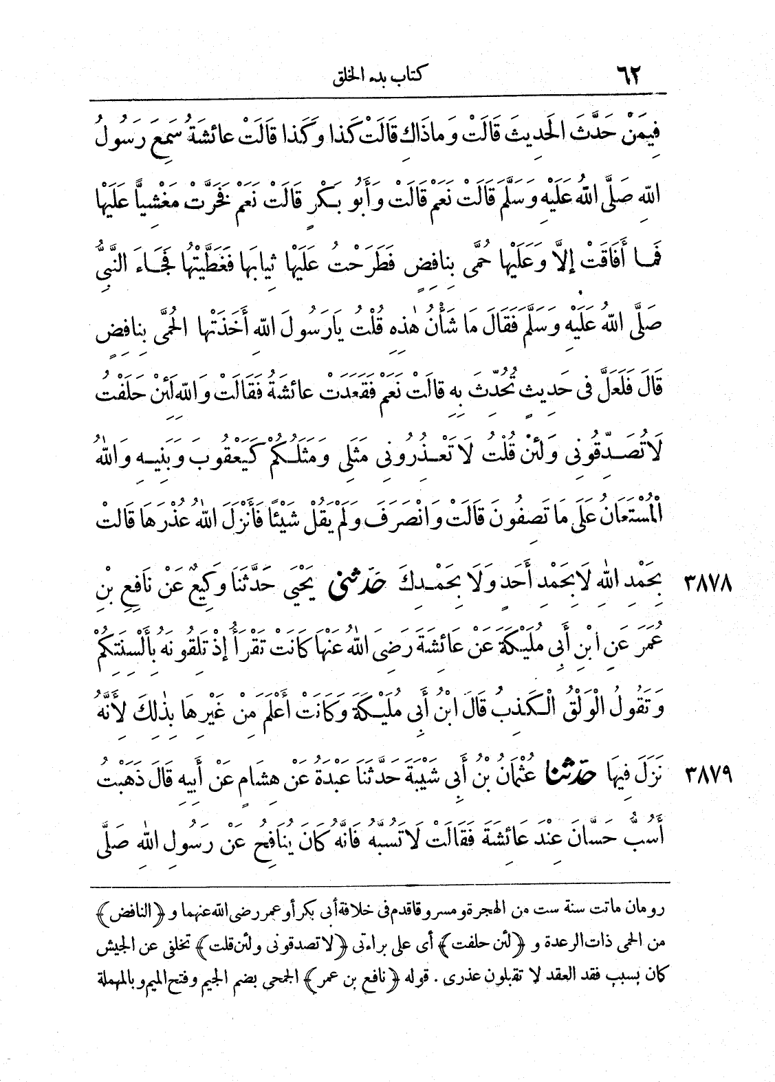 3878 - حَدَّثَنِى يَحْيَى حَدَّثَنَا وَكِيعٌ عَنْ نَافِعِ بْنِ عُمَرَ عَنِ ابْنِ أَبِى مُلَيْكَةَ عَنْ عَائِشَةَ - رضى الله عنها - كَانَتْ تَقْرَأُ (إِذْ تَلِقُونَهُ بِأَلْسِنَتِكُمْ) وَتَقُولُ الْوَلْقُ الْكَذِبُ. قَالَ ابْنُ أَبِى مُلَيْكَةَ وَكَانَتْ أَعْلَمَ مِنْ غَيْرِهَا بِذَلِكَ لأَنَّهُ نَزَلَ فِيهَا.
