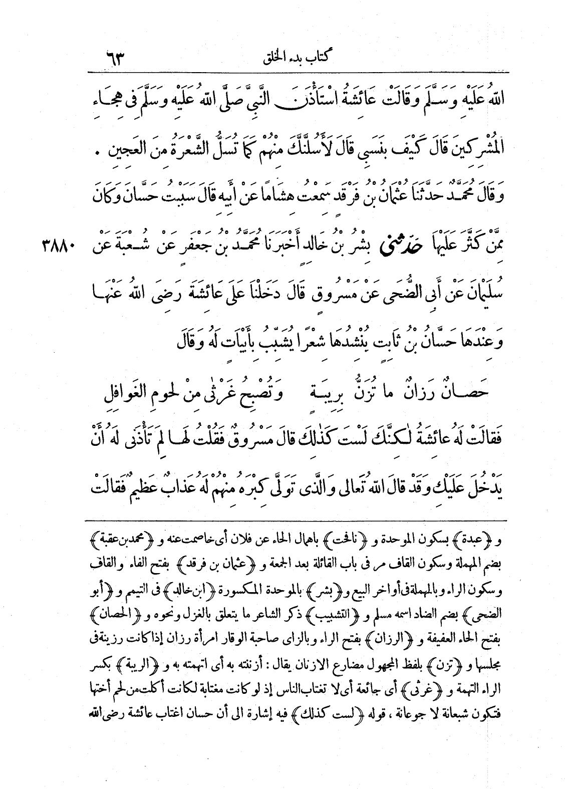 3880 - حَدَّثَنِى بِشْرُ بْنُ خَالِدٍ أَخْبَرَنَا مُحَمَّدُ بْنُ جَعْفَرٍ عَنْ شُعْبَةَ عَنْ سُلَيْمَانَ عَنْ أَبِى الضُّحَى عَنْ مَسْرُوقٍ قَالَ دَخَلْنَا عَلَى عَائِشَةَ - رضى الله عنها - وَعِنْدَهَا حَسَّانُ بْنُ ثَابِتٍ يُنْشِدُهَا شِعْراً، يُشَبِّبُ بِأَبْيَاتٍ لَهُ وَقَالَ حَصَانٌ رَزَانٌ مَا تُزَنُّ بِرِيبَةٍ وَتُصْبِحُ غَرْثَى مِنْ لُحُومِ الْغَوَافِلِ فَقَالَتْ لَهُ عَائِشَةُ لَكِنَّكَ لَسْتَ كَذَلِكَ. قَالَ مَسْرُوقٌ فَقُلْتُ لَهَا لِمَ تَاذَنِينَ لَهُ أَنْ يَدْخُلَ عَلَيْكِ. وَقَدْ قَالَ اللَّهُ تَعَالَى (وَالَّذِى تَوَلَّى كِبْرَهُ مِنْهُمْ لَهُ عَذَابٌ عَظِيمٌ). فَقَالَتْ