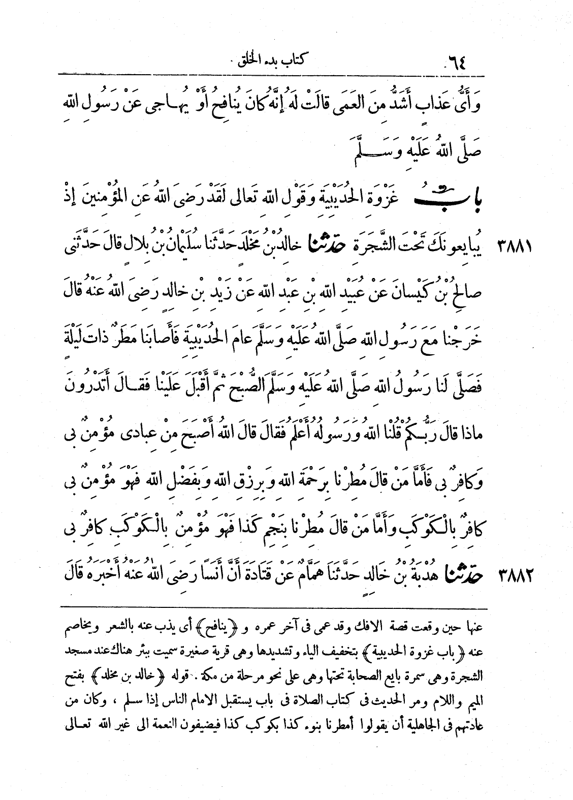 3881 - حَدَّثَنَا خَالِدُ بْنُ مَخْلَدٍ حَدَّثَنَا سُلَيْمَانُ بْنُ بِلاَلٍ قَالَ حَدَّثَنِى صَالِحُ بْنُ كَيْسَانَ عَنْ عُبَيْدِ اللَّهِ بْنِ عَبْدِ اللَّهِ عَنْ زَيْدِ بْنِ خَالِدٍ - رضى الله عنه - قَالَ خَرَجْنَا مَعَ رَسُولِ اللَّهِ صلى الله عليه وسلّم عَامَ الْحُدَيْبِيَةِ، فَأَصَابَنَا مَطَرٌ ذَاتَ لَيْلَةٍ، فَصَلَّى لَنَا رَسُولُ اللَّهِ صلى الله عليه وسلّم الصُّبْحَ، ثُمَّ أَقْبَلَ عَلَيْنَا فَقَالَ «أَتَدْرُونَ مَاذَا قَالَ رَبُّكُمْ». قُلْنَا اللَّهُ وَرَسُولُهُ أَعْلَمُ. فَقَالَ «قَالَ اللَّهُ أَصْبَحَ مِنْ عِبَادِى مُؤْمِنٌ بِى وَكَافِرٌ بِى، فَأَمَّا مَنْ قَالَ مُطِرْنَا بِرَحْمَةِ اللَّهِ وَبِرِزْقِ اللَّهِ وَبِفَضْلِ اللَّهِ. فَهْوَ مُؤْمِنٌ بِى، كَافِرٌ بِالْكَوْكَبِ. وَأَمَّا مَنْ قَالَ مُطِرْنَا بِنَجْمِ كَذَا. فَهْوَ مُؤْمِنٌ بِالْكَوْكَبِ، كَافِرٌ بِى».