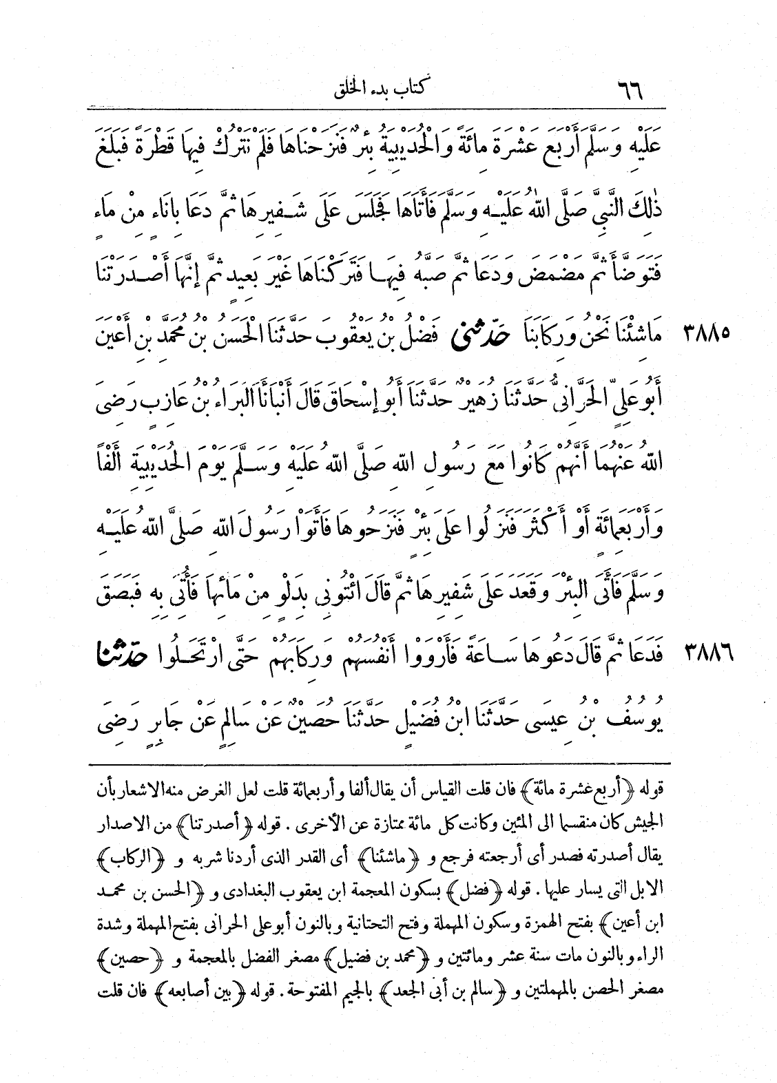 3885 - حَدَّثَنِى فَضْلُ بْنُ يَعْقُوبَ حَدَّثَنَا الْحَسَنُ بْنُ مُحَمَّدِ بْنِ أَعْيَنَ أَبُو عَلِىٍّ الْحَرَّانِىُّ حَدَّثَنَا زُهَيْرٌ حَدَّثَنَا أَبُو إِسْحَاقَ قَالَ أَنْبَأَنَا الْبَرَاءُ بْنُ عَازِبٍ - رضى الله عنهما أَنَّهُمْ كَانُوا مَعَ رَسُولِ اللَّهِ صلى الله عليه وسلّم يَوْمَ الْحُدَيْبِيَةِ أَلْفاً وَأَرْبَعَمِائَةٍ أَوْ أَكْثَرَ، فَنَزَلُوا عَلَى بِئْرٍ فَنَزَحُوهَا، فَأَتَوْا رَسُولَ اللَّهِ صلى الله عليه وسلّم فَأَتَى الْبِئْرَ، وَقَعَدَ عَلَى شَفِيرِهَا ثُمَّ قَالَ «ائْتُونِى بِدَلْوٍ مِنْ مَائِهَا». فَأُتِىَ بِهِ فَبَصَقَ فَدَعَا ثُمَّ قَالَ «دَعُوهَا سَاعَةً». فَأَرْوَوْا أَنْفُسَهُمْ وَرِكَابَهُمْ حَتَّى ارْتَحَلُوا.
