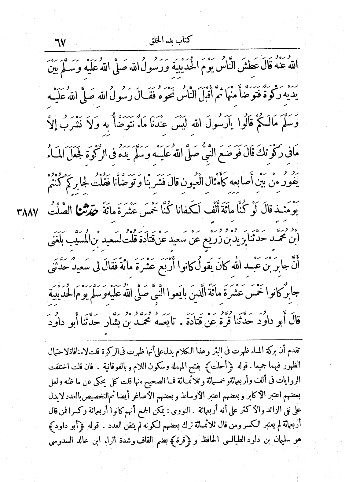 3887 - حَدَّثَنَا الصَّلْتُ بْنُ مُحَمَّدٍ حَدَّثَنَا يَزِيدُ بْنُ زُرَيْعٍ عَنْ سَعِيدٍ عَنْ قَتَادَةَ قُلْتُ لِسَعِيدِ بْنِ الْمُسَيَّبِ بَلَغَنِى أَنَّ جَابِرَ بْنَ عَبْدِ اللَّهِ كَانَ يَقُولُ كَانُوا أَرْبَعَ عَشْرَةَ مِائَةً. فَقَالَ لِى سَعِيدٌ حَدَّثَنِى جَابِرٌ كَانُوا خَمْسَ عَشْرَةَ مِائَةً الَّذِينَ بَايَعُوا النَّبِىَّ صلى الله عليه وسلّم يَوْمَ الْحُدَيْبِيَةِ. قَالَ أَبُو دَاوُدَ حَدَّثَنَا قُرَّةُ عَنْ قَتَادَةَ. تابعهُ مُحَمَّدُ بنُ بشارٍ حدَّثَنا أَبو داوُدَ