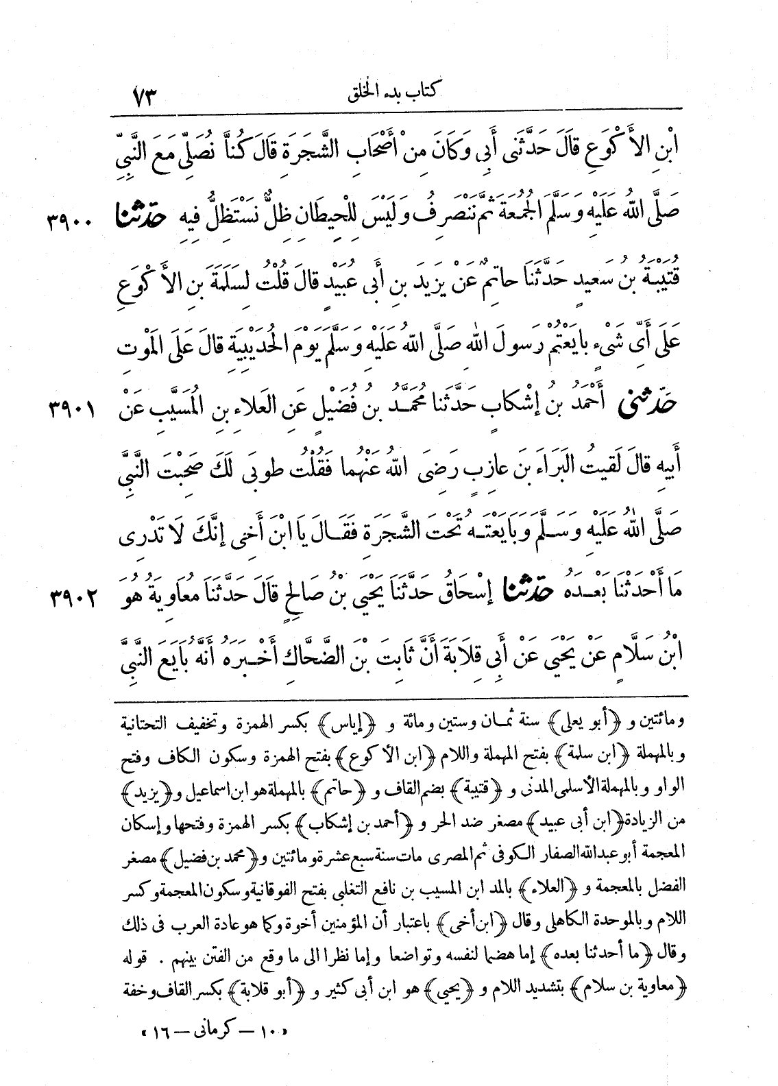 3901 - حَدَّثَنِى أَحْمَدُ بْنُ إِشْكَابٍ حَدَّثَنَا مُحَمَّدُ بْنُ فُضَيْلٍ عَنِ الْعَلاَءِ بْنِ الْمُسَيَّبِ عَنْ أَبِيهِ قَالَ لَقِيتُ الْبَرَاءَ بْنَ عَازِبٍ - رضى الله عنهما - فَقُلْتُ طُوبَى لَكَ صَحِبْتَ النَّبِىَّ صلى الله عليه وسلّم وَبَايَعْتَهُ تَحْتَ الشَّجَرَةِ. فَقَالَ يَا ابْنَ أَخِى إِنَّكَ لاَ تَدْرِى مَا أَحْدَثْنَا بَعْدَهُ.