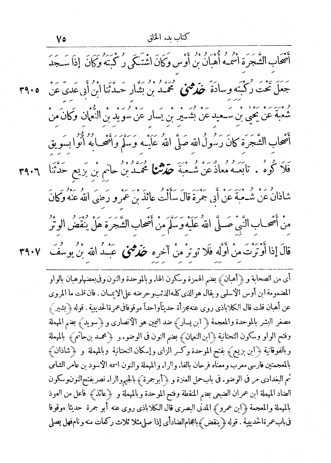 أي من الصحابة واهبان بضم الهمزة وسكون الهاء وبالموحدة والنون وفي بعضها وهبان بالواو المضمونة ابن اوس الاسلمي ويقال هو الذي كلمة الذئب وحرضه على الإيمان. فان قلت ما المروي عن اهبان قلت قال الكلا باذي روى عنه مجزأة حديثا واحدا موقوفا في عمرة الحديبية. قوله) بشير (مصغر البشر بالموحدة والمعجمة ابن يسار ضد اليمين هو الأنصاري و) سويد (بضم المهملة وبالفوقانية) ابن بزيع (بفتح الموحدة وكسر الزاي وإسكان التحتانية وبالمهملة و) شاذان (بالمعجمتين فارسي معرب ومعناه فرحان بالفاء والراء والمهملة والنون اسمه الأسود بن عامر الشامي ثم البغدادي مر في الوضوء في باب حمل العنزة و) أبو جمرة (بالجيم والراء نصر بفتح النون وسكون الضاد المهملة ابن عمران الضبعي بضم المنقطة وفتح الموحدة وبالمهملة وعائذ فاعل من العوذ بالمهملة والمعجمة) ابن عمرو (المدني البصري قال الكلا باذي روى عنه أبو جمرة حديثا موقوفا في باب عمرة الحديبية. قوله) ينقض (باعجام الضاد أي إذا صلى مثلا ثلاث ركعات منه ونام فهل يصلي