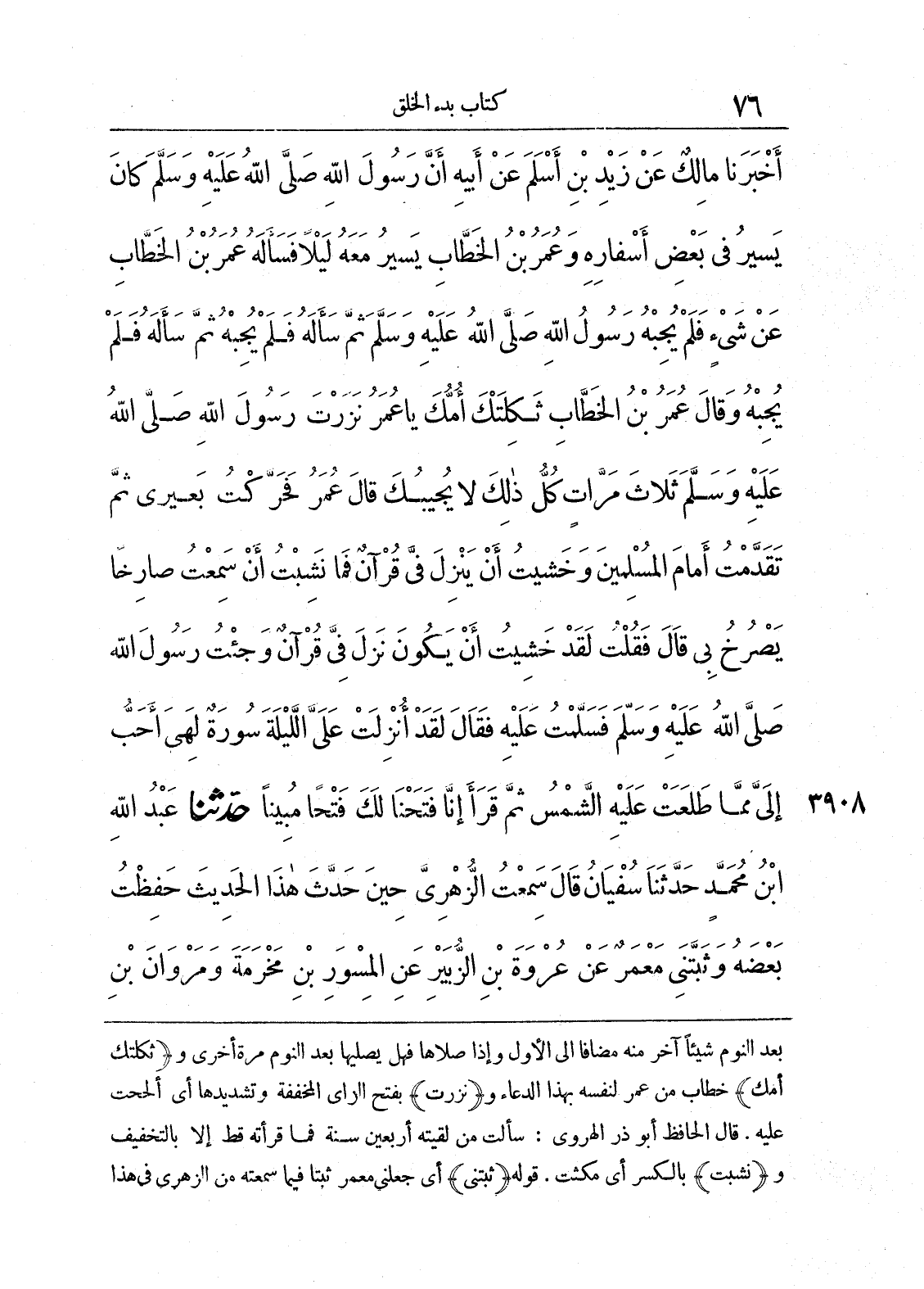 أَخْبَرَنَا مَالِكٌ عَنْ زَيْدِ بْنِ أَسْلَمَ عَنْ أَبِيهِ أَنَّ رَسُولَ اللَّهِ صلى الله عليه وسلّم كَانَ يَسِيرُ فِى بَعْضِ أَسْفَارِهِ، وَعُمَرُ بْنُ الْخَطَّابِ يَسِيرُ مَعَهُ لَيْلاً، فَسَأَلَهُ عُمَرُ بْنُ الْخَطَّابِ عَنْ شَىْءٍ فَلَمْ يُجِبْهُ رَسُولُ اللَّهِ صلى الله عليه وسلّم ثُمَّ سَأَلَهُ فَلَمْ يُجِبْهُ، ثُمَّ سَأَلَهُ فَلَمْ يُجِبْهُ وَقَالَ عُمَرُ بْنُ الْخَطَّابِ ثَكِلَتْكَ أُمُّكَ يَا عُمَرُ، نَزَرْتَ رَسُولَ اللَّهِ صلى الله عليه وسلّم ثَلاَثَ مَرَّاتٍ، كُلُّ ذَلِكَ لاَ يُجِيبُكَ. قَالَ عُمَرُ فَحَرَّكْتُ بَعِيرِى ثُمَّ تَقَدَّمْتُ أَمَامَ الْمُسْلِمِينَ، وَخَشِيتُ أَنْ يَنْزِلَ فِىَّ قُرْآنٌ، فَمَا نَشِبْتُ أَنْ سَمِعْتُ صَارِخاً يَصْرُخُ بِى - قَالَ - فَقُلْتُ لَقَدْ خَشِيتُ أَنْ يَكُونَ نَزَلَ فِىَّ قُرْآنٌ. وَجِئْتُ رَسُولَ اللَّهِ صلى الله عليه وسلّم فَسَلَّمْتُ عَلَيْهِ فَقَالَ «لَقَدْ أُنْزِلَتْ عَلَىَّ اللَّيْلَةَ سُورَةٌ لَهِىَ أَحَبُّ إِلَىَّ مِمَّا طَلَعَتْ عَلَيْهِ الشَّمْسُ، ثُمَّ قَرَأَ (إِنَّا فَتَحْنَا لَكَ فَتْحاً مُبِيناً)».