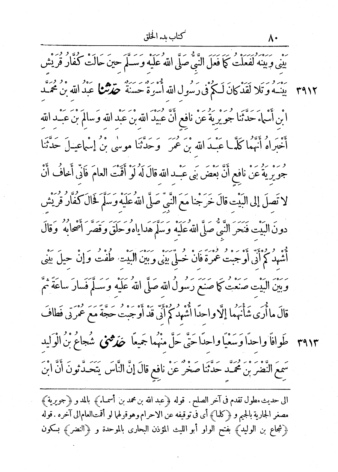 3912 - حَدَّثَنَا عَبْدُ اللَّهِ بْنُ مُحَمَّدِ بْنِ أَسْمَاءَ حَدَّثَنَا جُوَيْرِيَةُ عَنْ نَافِعٍ أَنَّ عُبَيْدَ اللَّهِ بْنَ عَبْدِ اللَّهِ وَسَالِمَ بْنَ عَبْدِ اللَّهِ أَخْبَرَاهُ أَنَّهُمَا كَلَّمَا عَبْدَ اللَّهِ بْنَ عُمَرَ. وَحَدَّثَنَا مُوسَى بْنُ إِسْمَاعِيلَ حَدَّثَنَا جُوَيْرِيَةُ عَنْ نَافِعٍ أَنَّ بَعْضَ بَنِى عَبْدِ اللَّهِ قَالَ لَهُ لَوْ أَقَمْتَ الْعَامَ، فَإِنِّى أَخَافُ أَنْ لاَ تَصِلَ إِلَى الْبَيْتِ. قَالَ خَرَجْنَا مَعَ النَّبِىِّ صلى الله عليه وسلّم فَحَالَ كُفَّارُ قُرَيْشٍ دُونَ الْبَيْتِ، فَنَحَرَ النَّبِىُّ صلى الله عليه وسلّم هَدَايَاهُ، وَحَلَقَ وَقَصَّرَ أَصْحَابُهُ، وَقَالَ «أُشْهِدُكُمْ أَنِّى أَوْجَبْتُ عُمْرَةً». فَإِنْ خُلِّىَ بَيْنِى وَبَيْنَ الْبَيْتِ طُفْتُ، وَإِنْ حِيلَ بَيْنِى وَبَيْنَ الْبَيْتِ صَنَعْتُ كَمَا صَنَعَ رَسُولُ اللَّهِ صلى الله عليه وسلّم فَسَارَ سَاعَةً ثُمَّ قَالَ مَا أُرَى شَانَهُمَا إِلاَّ وَاحِداً، أُشْهِدُكُمْ أَنِّى قَدْ أَوْجَبْتُ حَجَّةً مَعَ عُمْرَتِى. فَطَافَ طَوَافاً وَاحِداً وَسَعْياً وَاحِداً، حَتَّى حَلَّ مِنْهُمَا جَمِيعاً.
