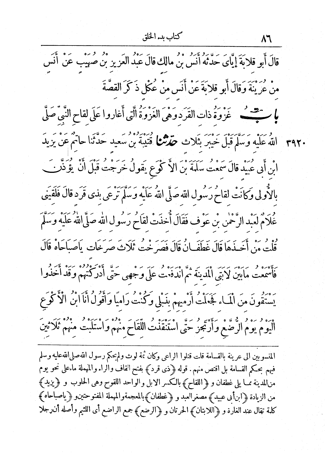 3920 - حَدَّثَنَا قُتَيْبَةُ بْنُ سَعِيدٍ حَدَّثَنَا حَاتِمٌ عَنْ يَزِيدَ بْنِ أَبِى عُبَيْدٍ قَالَ سَمِعْتُ سَلَمَةَ بْنَ الأَكْوَعِ يَقُولُ خَرَجْتُ قَبْلَ أَنْ يُؤَذَّنَ بِالأُولَى، وَكَانَتْ لِقَاحُ رَسُولِ اللَّهِ صلى الله عليه وسلّم تَرْعَى بِذِى قَرَدٍ - قَالَ - فَلَقِيَنِى غُلاَمٌ لِعَبْدِ الرَّحْمَنِ بْنِ عَوْفٍ فَقَالَ أُخِذَتْ لِقَاحُ رَسُولِ اللَّهِ صلى الله عليه وسلّم قُلْتُ مَنْ أَخَذَهَا قَالَ غَطَفَانُ. قَالَ فَصَرَخْتُ ثَلاَثَ صَرَخَاتٍ - يَا صَبَاحَاهْ - قَالَ فَأَسْمَعْتُ مَا بَيْنَ لاَبَتَىِ الْمَدِينَةِ، ثُمَّ انْدَفَعْتُ عَلَى وَجْهِى حَتَّى أَدْرَكْتُهُمْ وَقَدْ أَخَذُوا يَسْتَقُونَ مِنَ الْمَاءِ، فَجَعَلْتُ أَرْمِيهِمْ بِنَبْلِى، وَكُنْتُ رَامِياً، وَأَقُولُ أَنَا ابْنُ الأَكْوَعْ، الْيَوْمُ يَوْمُ الرُّضَّعْ. وَأَرْتَجِزُ حَتَّى اسْتَنْقَذْتُ اللِّقَاحَ مِنْهُمْ، وَاسْتَلَبْتُ مِنْهُمْ ثَلاَثِينَ