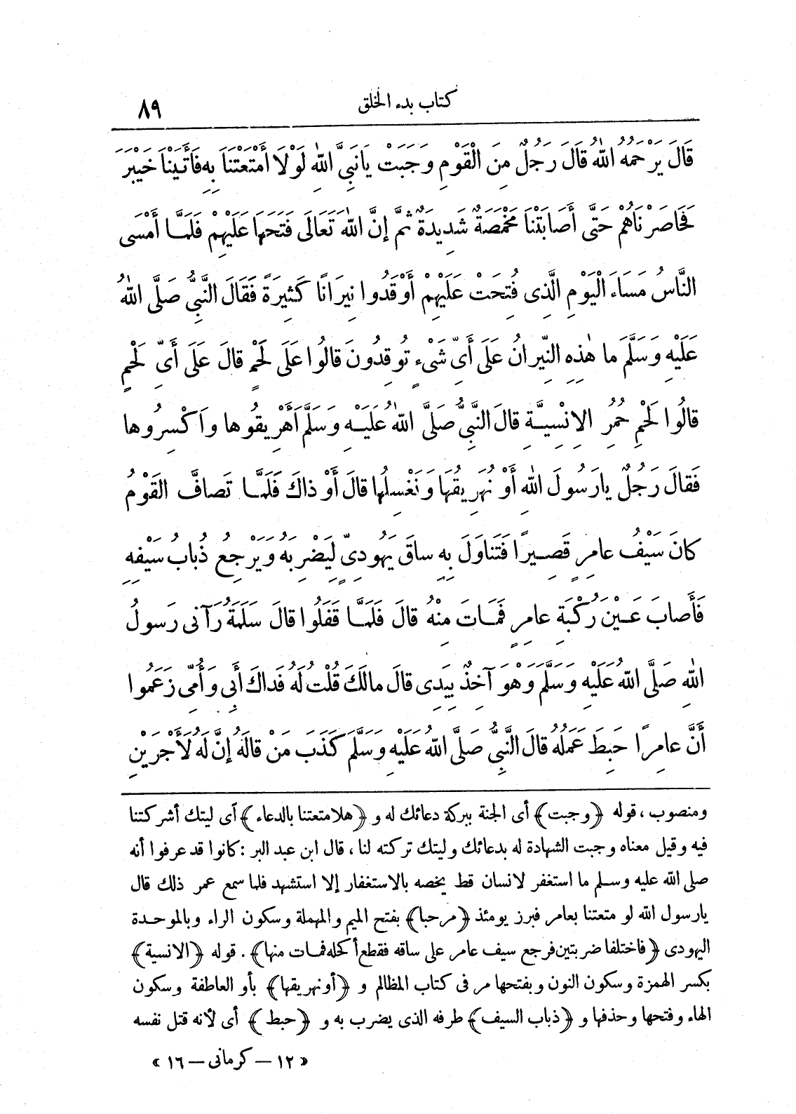 ومنصوب، قوله و) جبت (أي الجنة ببركة دعائك و) هلا متعتنا بالدعاء (أي ليتك أشركتنا فيه وقيل معناه وجبت الشهادة له بدعائك وليتك تركته لنا، قال ابن عبد البر: كانوا قد عرفوا انه صلى الله عليه وسلم ما استغفر لإنسان قط يخصه بالاستغفار إلا استشهد فلما سمع عمر ذلك قال يا رسول الله لو متعتنا بعامر فبرز يومئذ) مرحبا (بفتح الميم والمهملة وسكون الراء وبالموحدة اليهودي) فاختلفا ضربتين فرجع سيف عامر على ساقه فقطع أكحله فمات منها (. قوله الانسية بكسر الهمزة وسكون النون وبفتحها مر في كتاب المظالم وأو نهريقها (بآو العاطفة وسكون الهاء وفتحها وحذفها) ضباب السيف (طرفه الذي يضرب به و) حبط (أي لأنه قتل نفسه