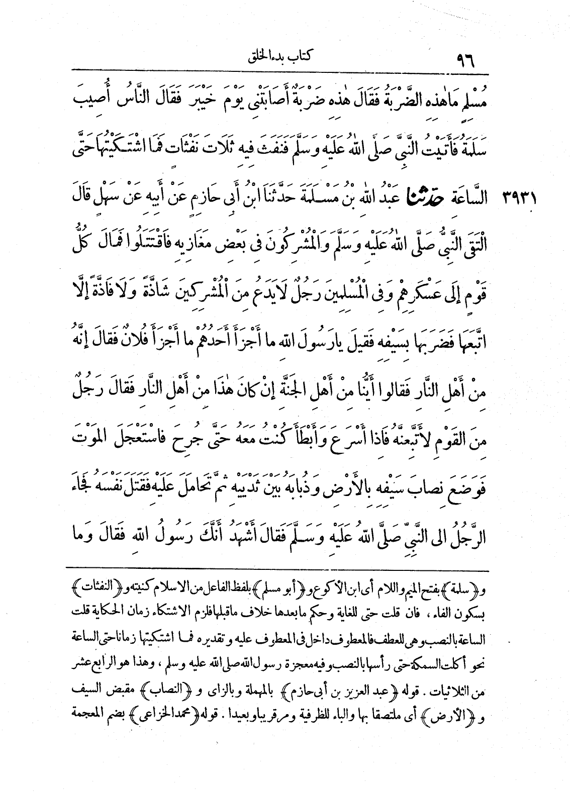مُسْلِمٍ، مَا هَذِهِ الضَّرْبَةُ قَالَ هَذِهِ ضَرْبَةٌ أَصَابَتْنِى يَوْمَ خَيْبَرَ، فَقَالَ النَّاسُ أُصِيبَ سَلَمَةُ. فَأَتَيْتُ النَّبِىَّ صلى الله عليه وسلّم فَنَفَثَ فِيهِ ثَلاَثَ نَفَثَاتٍ، فَمَا اشْتَكَيْتُهَا حَتَّى السَّاعَةِ.