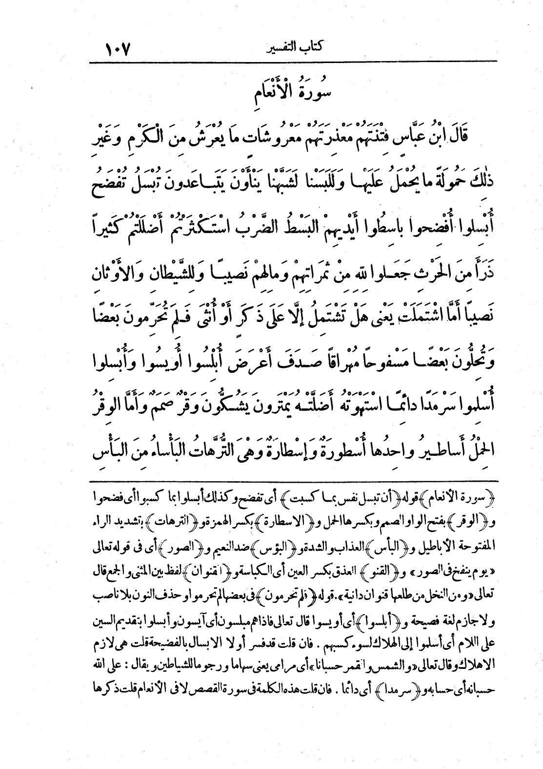 (سورة الأنعام) قوله (أن تبسل نس ما كسبت) أي تضح وكذلك أبسلوا بما كسبوا أي ضحوا و (الوقر) بفتح الواو الصمم وبكسرها الحمل و (الاسطارة) بكسر الهمزة و (الترهات) بتشديد الراء المفتوحة الأباطيل و (البأس) العذاب والشدة و (البؤس) ضد النعيم و (الصور) أي في قوله تعالى "يوم ينفخ ي الصور" و (القنو) العذق بكسر العين أي الكباسة و (القنوان) لفظ بين المثنى والجمع قال تعالى "ومن النخل من طلعها قنوان دانية". قوله (لم تحرمون) في بعضها لم تحرموا وحذف النون بلا ناصب ولا جازم لغة صيحة و (أبلسوا) أي أويسوا قال تعالى إذا هم مبلسون أي آيسون وأبسلوا بتقديم السين على اللام أي أسلموا إلى الهلاك لسوء كسبهم. إن قلت قد سر أولا الأبسال بالفضيحة قلت هي لازم الأهلاك وقال تعالى "والشمس والقمر حسبانا" أي مرامي يعني سهاما ورجوما للشياطين ويقال: على الله حسبانه أي حسابه و (سرمدا) أي دائما. إن قلت هذه الكلمة في سورة القصص لا في الأنعام قلت ذكرها
