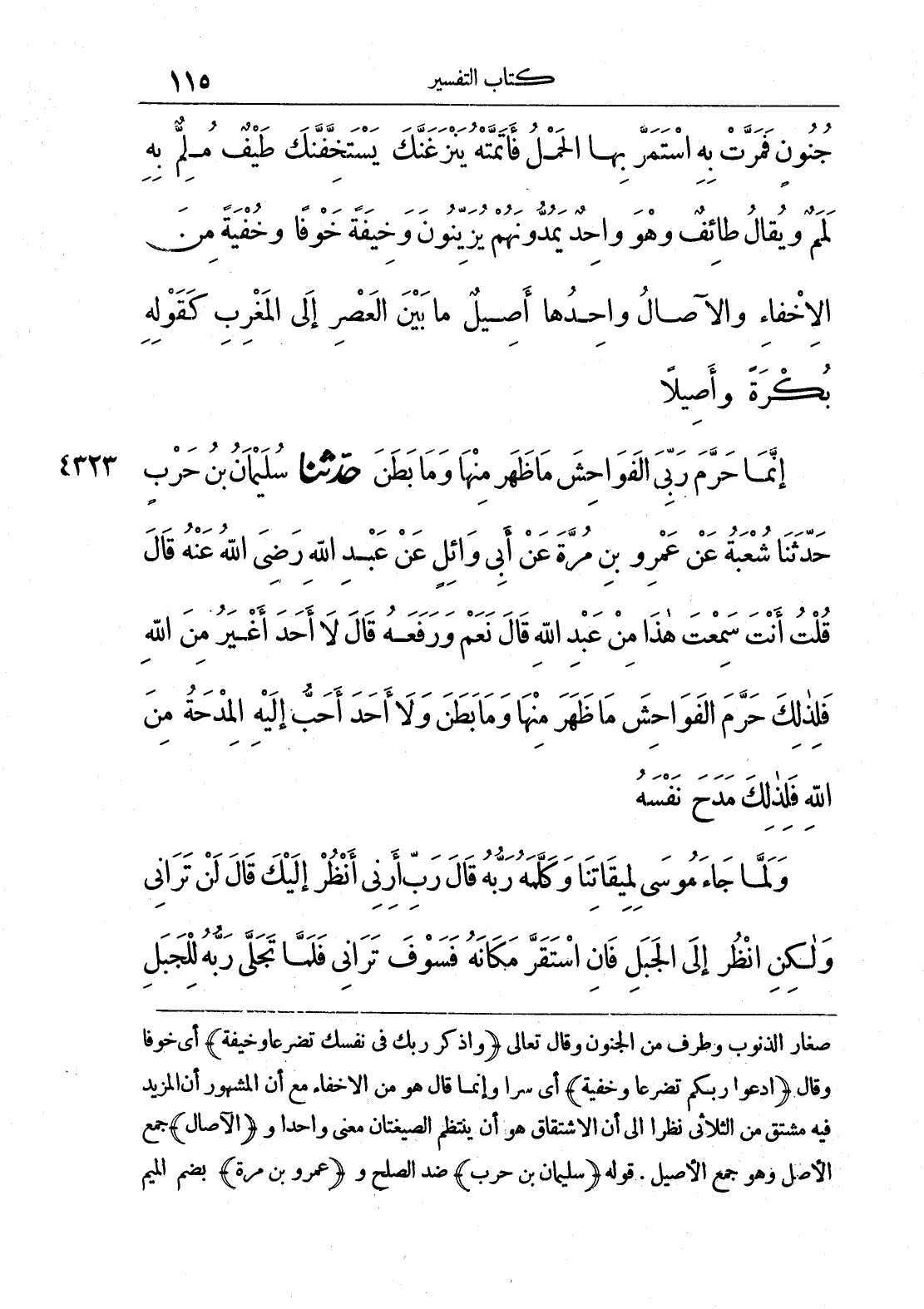 صغار الذنوب وطرف من الجنون وقال تعالى (واذكر ربك في نفسك تضرعا وخيفة) أي خوفا وقال (ادعوا ربكم تضرعا وخيفة) أي سرا وإنما قال هو من الإخفاء مع أن المشهور أن المزيد فيه مشتق من الثلاثي نظرا إلى الاشتقاق هو أن ينتظم الصيغتان معنى واحدا و (الآصال) جمع الأصل وهو جمع الأصيل. قوله (سليمان بن حرب) ضد الصلح و (عمرو بن مرة) بضم الميم