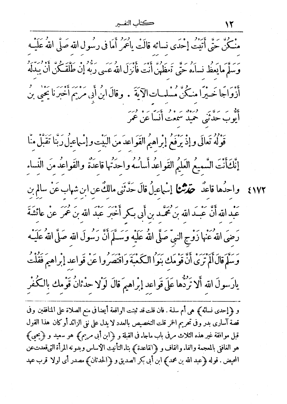 و (إحدى نسائه) هي أم سلمة. فإن قلت قد ثبتت الواقعة أيضا في منع الصلاة على المنافقين وفي قصة آساري بدر وفي تحريم الخمر قلت التخصيص بالعدد لا يدل على نفي الزائد أو كان هذا القول قبل موافقة غير هذه الثلاث مر في باب ما جاء في القبلة و (ابن أبي مريم) وهو سعيد و (يحيي) هو الغافقي بالمعجمة والفاء والقاف و (القاعدة) بتاء التأنيث الأساس وبدونه المرأة التي قعدت عن المحيض. قوله (عبد الله بن محمد) ابن أبي بكر الصديق و (الحدثان) مصدر أي لولا قرب عهد