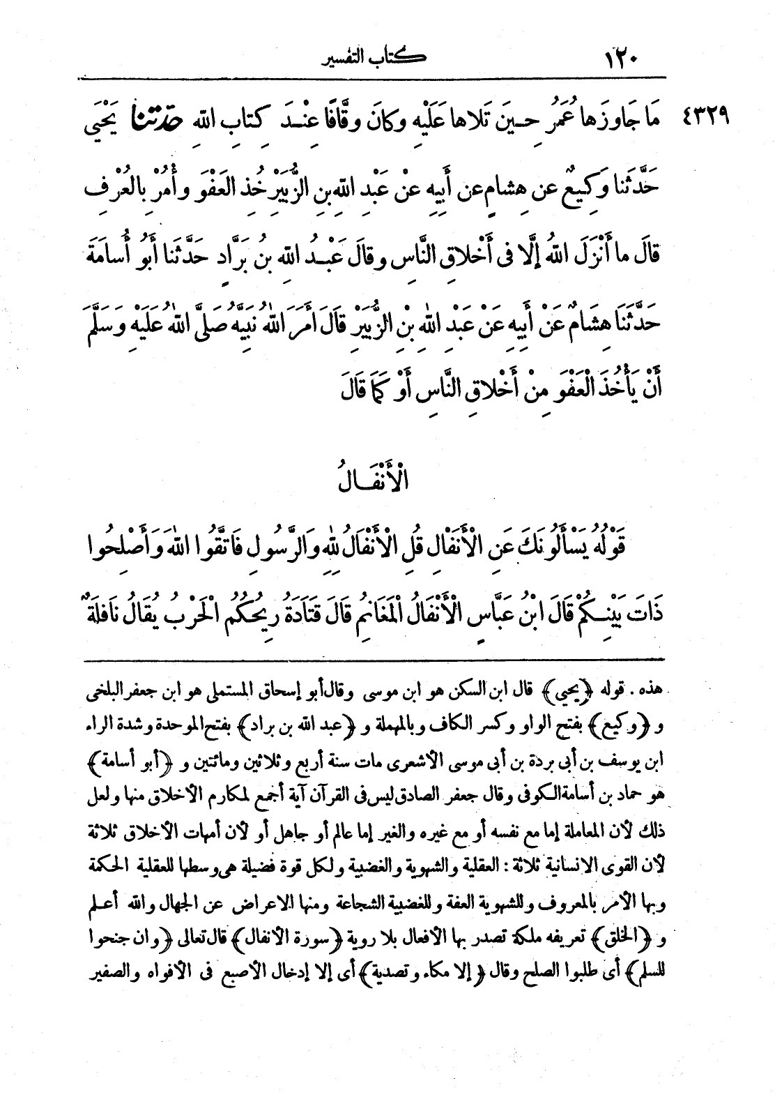 هذه. قوله (يحيى) قال ابن السكن هو ابن موسى وقال أبو إسحاق المستملي هو ابن جعفر البلخي و (وكيع) بفتح الواو وسر الكاف وبالمهملة و (عبد الله بن براد) بفتح الموحدة وشدة الراء ابن يوسف بن أبي بردة بن أبي موسى الأشعري مات سنة أربع وثلاثين ومائتين و (أبو أسامة) هو حماد بن أسامة الكوفي وقال جعفر الصادق ليس في القرآن آية أجمع لمكارم الأخلاق منها ولعل ذلك لأن المعاملة إما مع نفسه أو مع غيره والغير إما عالم أو جاهل أو لأن أمهات الأخلاق ثلاثة لأن القوى الإنسانية ثلاثة: العقلية والشهوية والغضبية ولكل قوة ضئيلة هي وسطها للعقلية الحكمة وبها الأمر بالمعروف وللشهوية العفة وللغضبية الشجاعة ومنها الأعراض عن الجهال والله أعلم و (الخلق) تعريفه ملكة تصدر بها الأعال بلا روية (سورة الأنفال) قال تعالى (وإن جنحوا للسلم) أي طلبوا الصلح وقال (إلا مكاء وتصدية) أي إلا إدخال الأصبع في الأفواه والصفير