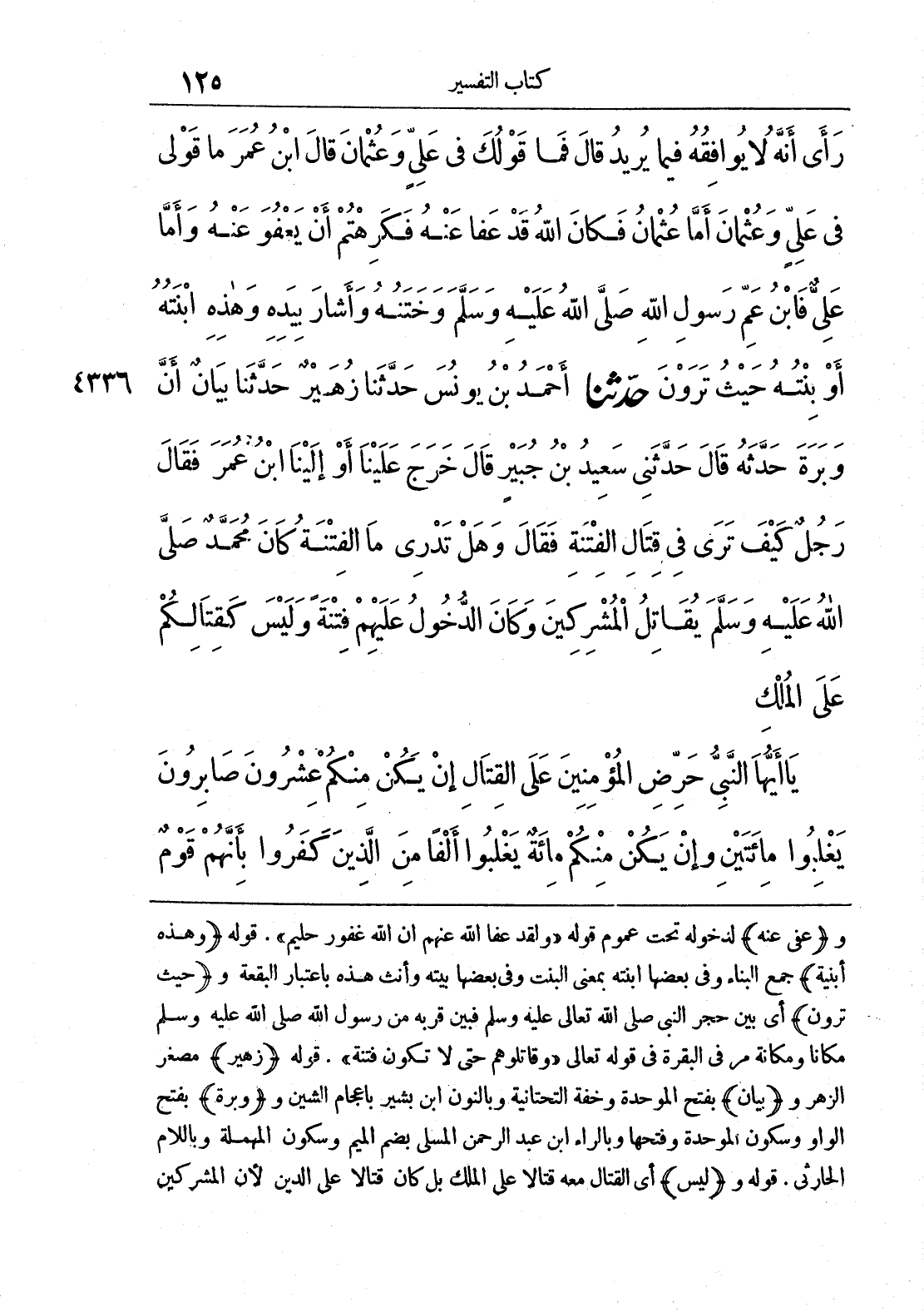 و (عفى عنه) لدخوله تحت عموم قوله "ولقد عفا الله عنهم أن الله غفور حليم" قوله (وهذه أبنية) جمع البناء وفي بعضها ابنته بمعنى البنت وفي بعضها بيته وأنت هذه باعتبار البقعة و (حيث ترون) أي بين حجر النبي صلى الله تعالى عليه وسلم فبين قربة من رسول الله صلى الله عليه وسلم مكانا ومكانة مر في البقرة في قوله تعالى "وقاتلوهم حتى لا تكون فتنة". قوله (زهير) مصغر الزهر و (بيان) بفتح الموحدة وخفة التحتانية وبالنون ابن بشير بإعجام الشين و (وبرة) بفتح الواو وسكون الموحدة وفتحها وبالراء ابن عبد الرحمن المسلي بضم الميم وسكون المهملة وباللام الحارثي. قوله و (ليس) أي القتال معه قتالا على الملك بل كان قتالا على الدين لأن المشركين