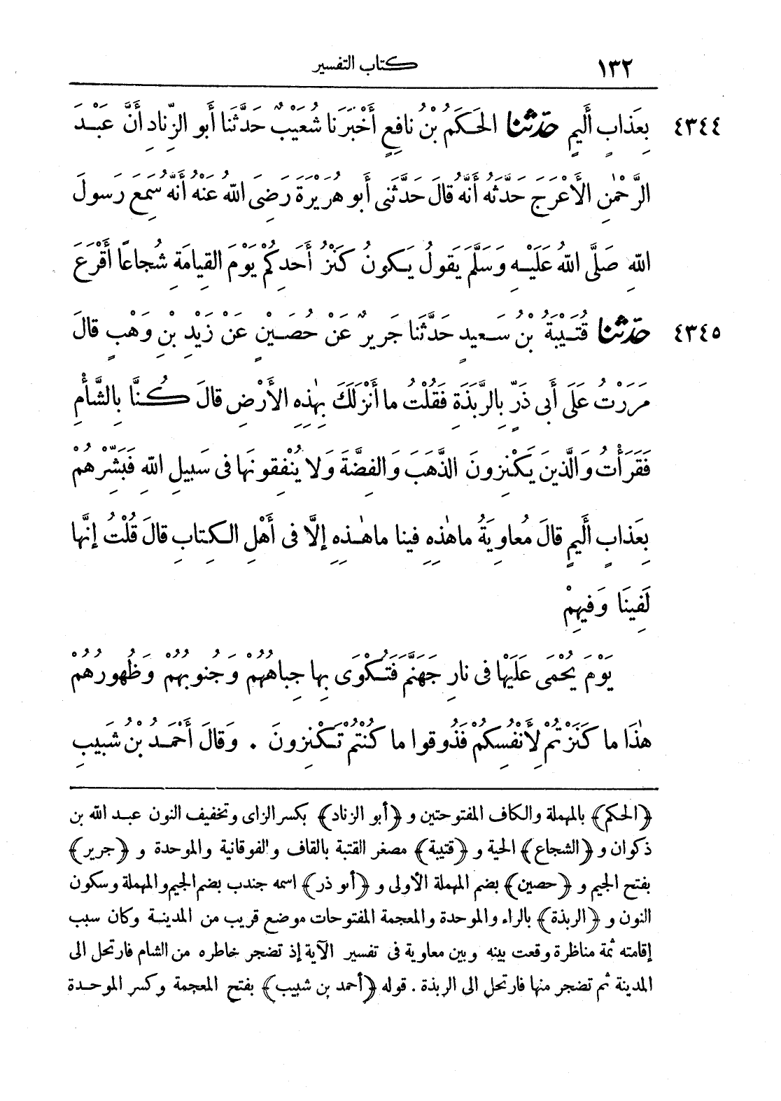 (الحكم) بالمهملة والكاف المفتوحتين و (أبو الزناد) بكسر الزاي وتخفيف النون عبد الله بن ذكوان و (الشجاع) الحية و (قتيبة) مصغر القتبة بالقاف والفوقانية والموحدة و (جرير) بفتح الجيم و (حصين) بضم المهملة الأولى و (أبو ذر) اسمه جندب بضم الجيم والمهملة وسكون النون و (الربذة) بالراء والموحدة والمعجمة والمفتوحات موضع قريب من المدينة وكان سبب إقامته ثمة مناظر وقعت بينه وبين معاوية في تفسير الآية إذ تضجر خاطره من الشام ارتحل إلى المدينة ثم تضجر منها ارتحل إلى الربذة. قوله (أحمد بن شبيب) بفتح المعجمة وكسر الموحدة